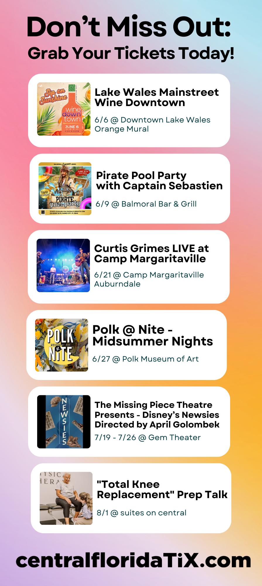 There’s an electrifying summer event at Camp Margaritaville Auburndale featuring an unforgettable live concert with the incredibly talented Curtis Grimes. From being a standout contestant on NBC’s “The Voice,” to charting multiple number one hits on the Texas Country Music Chart, Curtis Grimes has proven time and again that he’s a force to be reckoned with in the country music scene. VIP available. More info at centralfloridatix.com