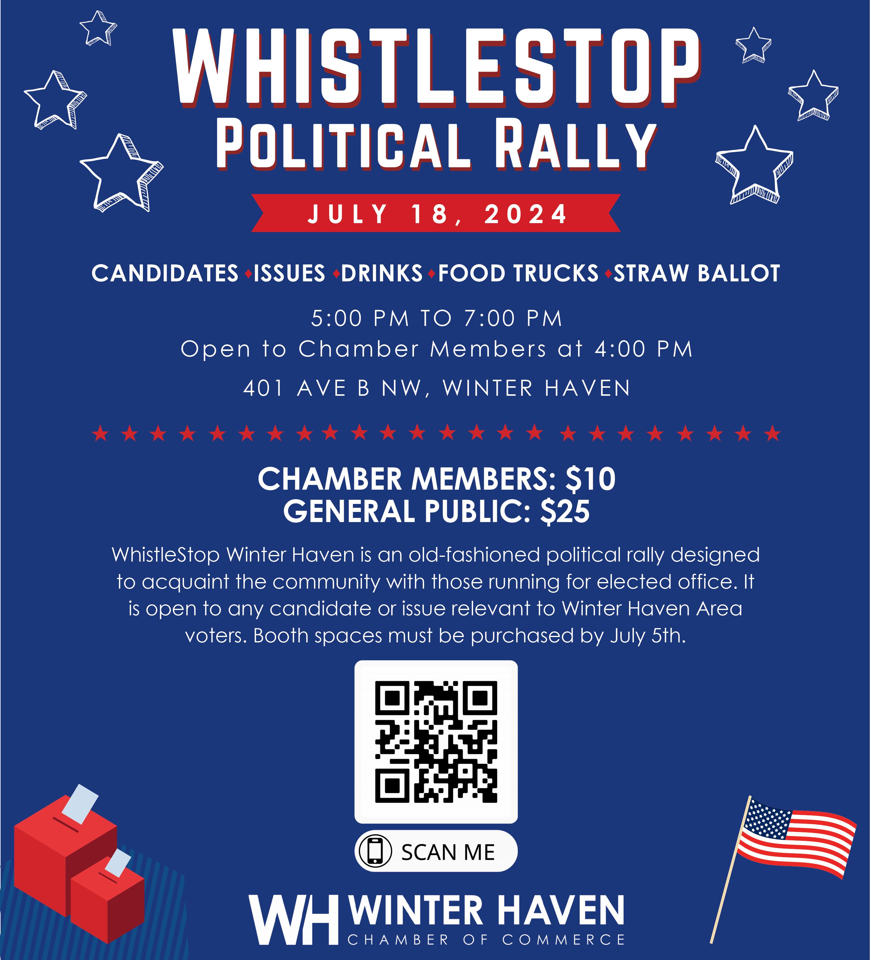 WhistleStop Winter Haven is a political rally designed to acquaint the community with those local residents running for elected office. WhistleStop Winter Haven is hosted by the Winter Haven Chamber of Commerce. This year’s event is July 18 at the Chamber building in downtown Winter Haven. It is open to any candidate or issue relevant to Winter Haven area voters. Winter Haven Chamber members can get tickets for $10. General Public tickets cost $25. Winter Haven Chamber members get in an hour early at 4 pm and the general public gets into the event at 5 pm. Candidate Booth spaces must be purchased by July 12. If you are interested in participating as a candidate, please email hannah@winterhavenchamber.com.