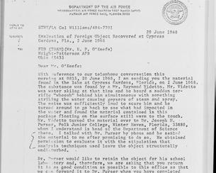 students before sending it forward to the Air Force. The object was shipped through military channels to Wright-Patterson Air Force Base in Dayton, Ohio, home of Project Blue Book, the Air Force’s official UFO investigation program. On June 12, Lt. Col. Hector Quintanilla, Blue Book’s final chief, reviewed the case. The object was repeatedly described as “light,” “porous,” and filled with “air holes” more like pumice than anything metallic or extraterrestrial.