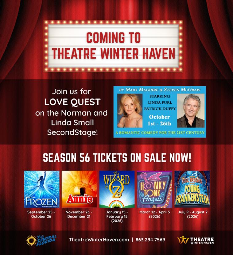 Oct. 1 – 26 at Theatre Winter Haven, starring Linda Purl & Patrick Duffy! Two women meet after a bad date goes awry and become friends and allies in this strange new dating world. Each has started with different goals, and they both find something they didn’t expect. theatrewinterhaven.com