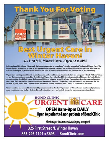 In December of 2014, Bond Clinic made the important decision to expand our “extended hours clinic” to be a full Urgent Care. The largest changes included an increase of our hours and treating those who were not established Bond Clinic patients. This lined up with our overall goal to provide quality medical care, close to home, with reduced cost and greater access to our community. Urgent Care is an important layer to medical care and can be used in many situations that are not emergency related. At Bond Clinic, we saw that many patients needed the flexibility that Urgent Care offered and felt it was important to add this service backed by the reputation of the Bond Clinic name. In January of 2018, we relocated to our First Street Campus in order to increase our hours to 8am - 8pm daily, expand our space and add more providers to the team. “People have embraced us and it has confirmed that our decision to grow Bond Clinic Urgent Care has met a need,” said Dr. Iakovidis, Bond Clinic CEO/President of the Board. We are humbled and honored to be selected by our community as The Best Urgent Care in Winter Haven. Our team of physicians, nurse practitioners and staff are dedicated to each patient they serve and we look forward to many more years of excellence.