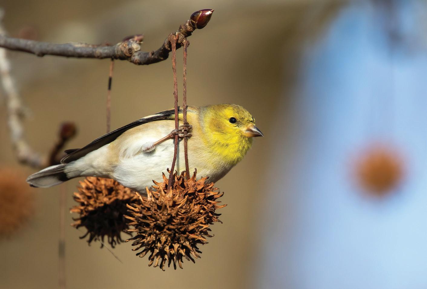 Kandula, who is leaning toward a major in neuroscience, captured this image early on a January morning. “This nonbreeding male American goldfinch was sitting on an American sweetgum tree in the meadow near the Duck Pond,” he says. Kandula used a Canon digital camera and a lens extender to get the shot, which required, he says, “just a bit of patience to wait for one of the goldfinches in the flock to move down to eye level. The light-weight goldfinches love to hang from the strong stems of sweetgum capsules and pluck out the seeds with their sharp bills. I love how you can see that behavior here and the slight impression of another spherical seed pod on the right.”