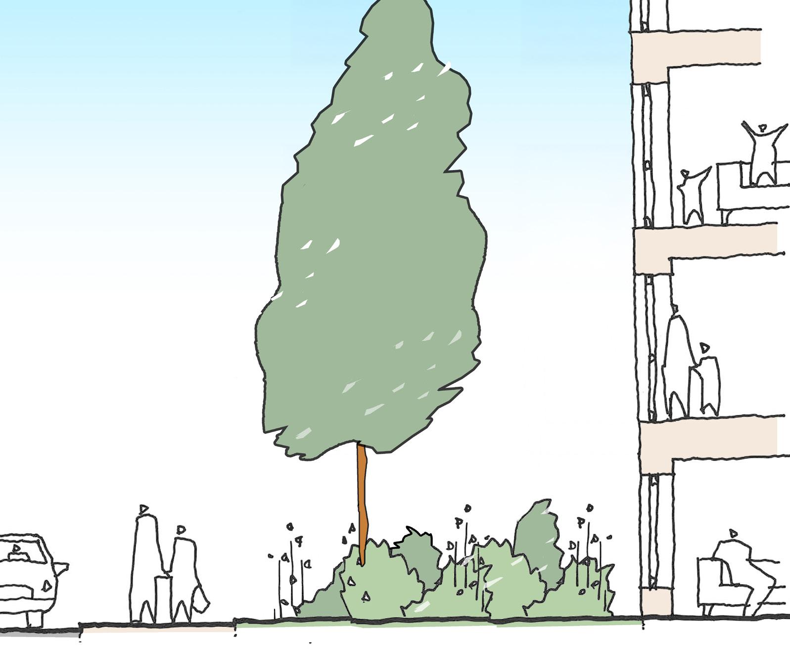 1.03.02 Expand the public realm along each of the desire line routes and incorporate enhanced landscaping features to create green corridors through the development.