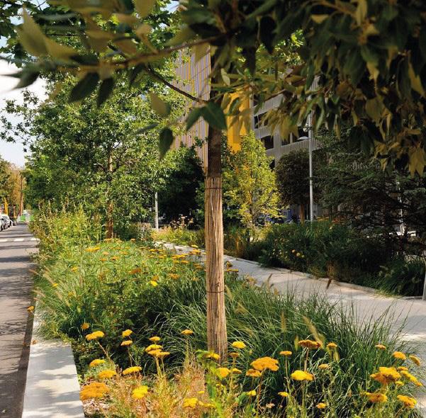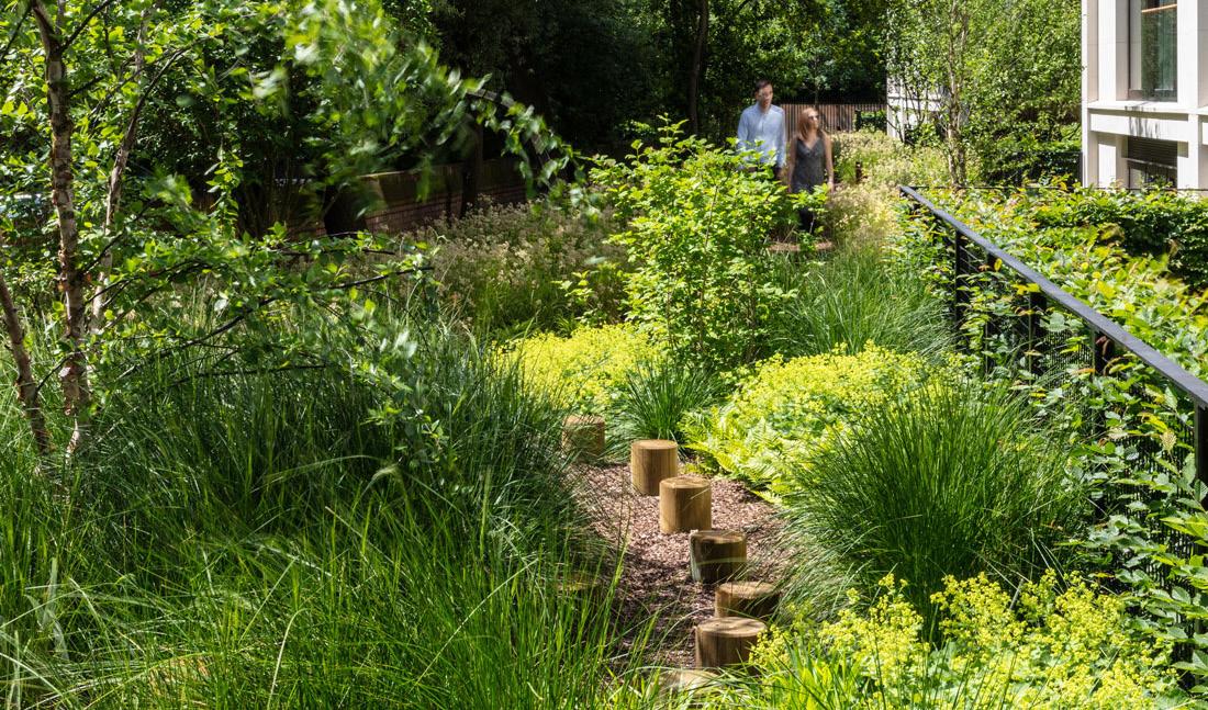 Lush and ecologically rich boundary planting reinforces green corridor to railway line.