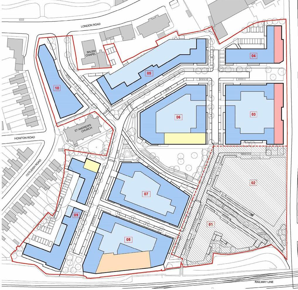 THE CONSENTED MASTERPLAN SHOWING PLOT 9 & 10, MODULAR HOUSING , ST ANDREWS CARPARK CHANGE OF USE AREA, & COMMUNITY GARDEN