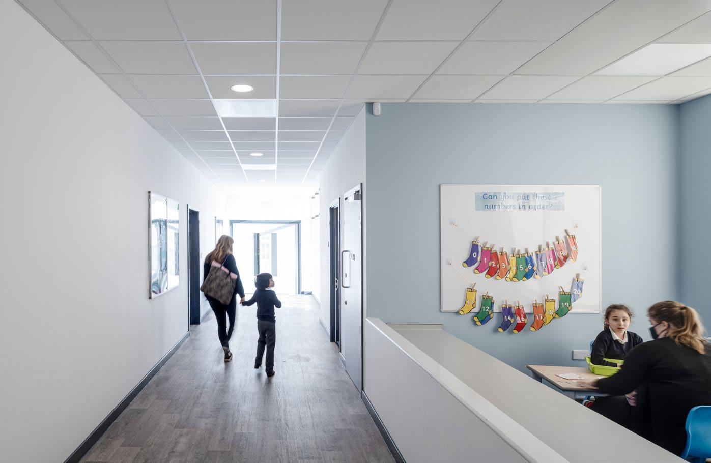 The existing spaces within the school were re-organised alongside the provision of the new accommodation to provide a clear clustering strategy to all year groups and to offer increased clarity to the school layout. This addressed the critical issues with the existing school design including back log maintenance and also allowed for clear age progression, generous circulation and improved environmental conditions to all class bases.