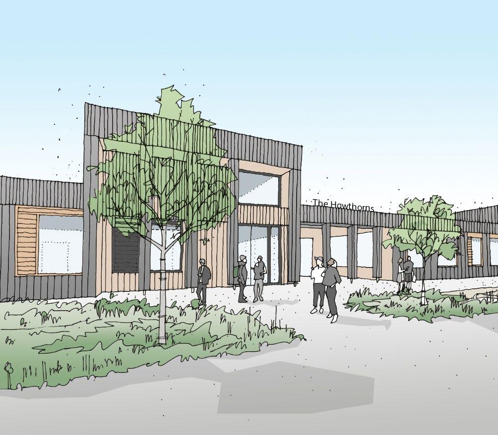 The Hawthorns School: New build school 70 place school for students aged 7 – 16, with complex autism. The single storey building with associated landscape works and car park, student drop off will also include residential accommodation for 10 students.