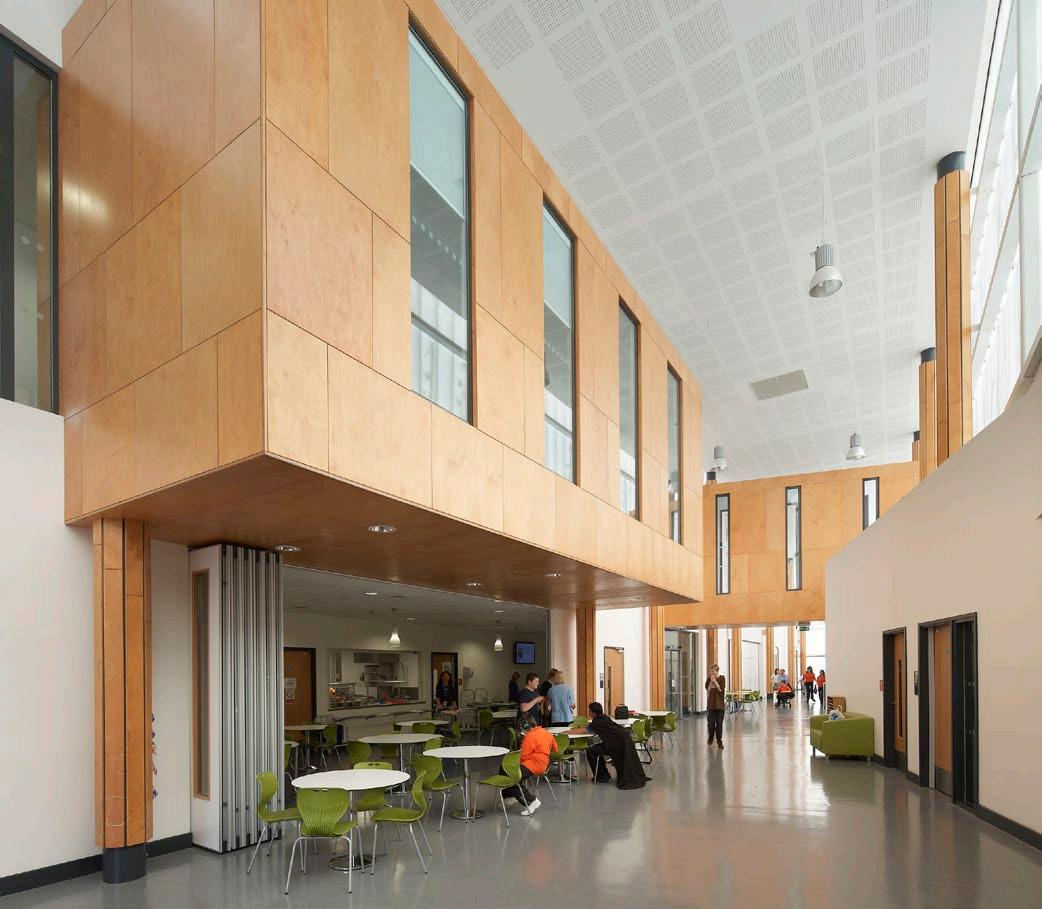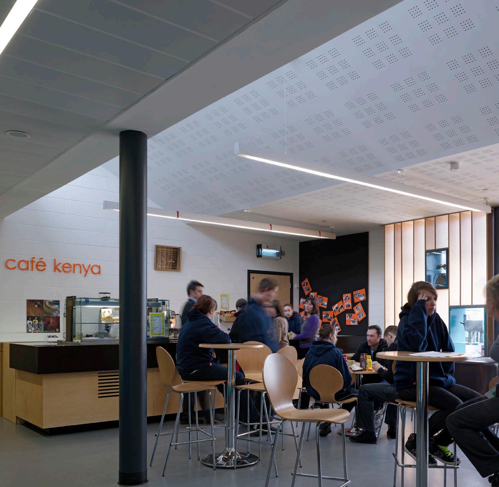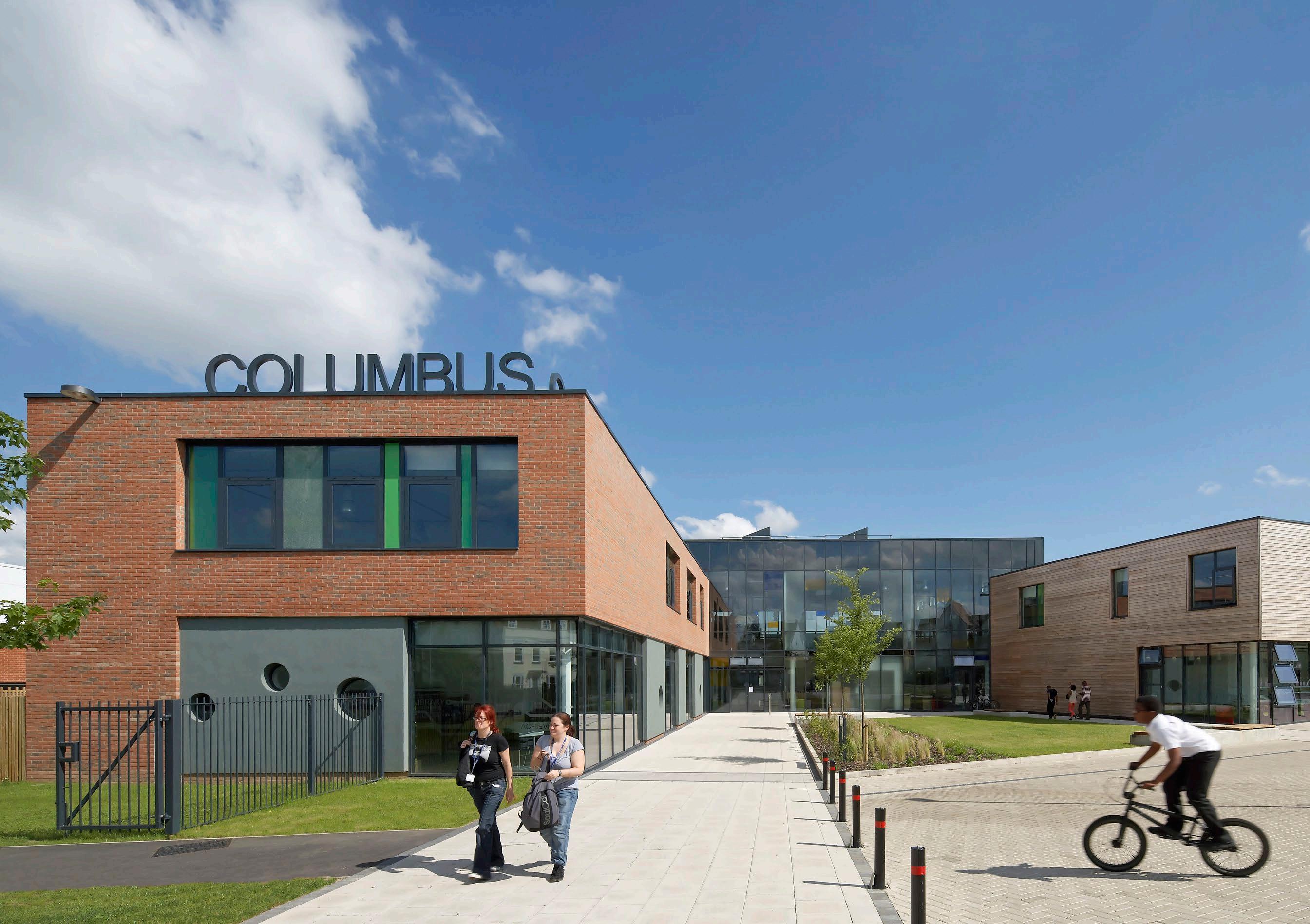 A range of social and personalised learning areas are provided at ground and first floor level in and around the atrium. At the front the new college creates a large community square known as “Columbus Square”. This provides a space for the local community to celebrate, to eat, drink, sit, meet, hold events and enjoy in the community cafe, hall and library provisions on the site.