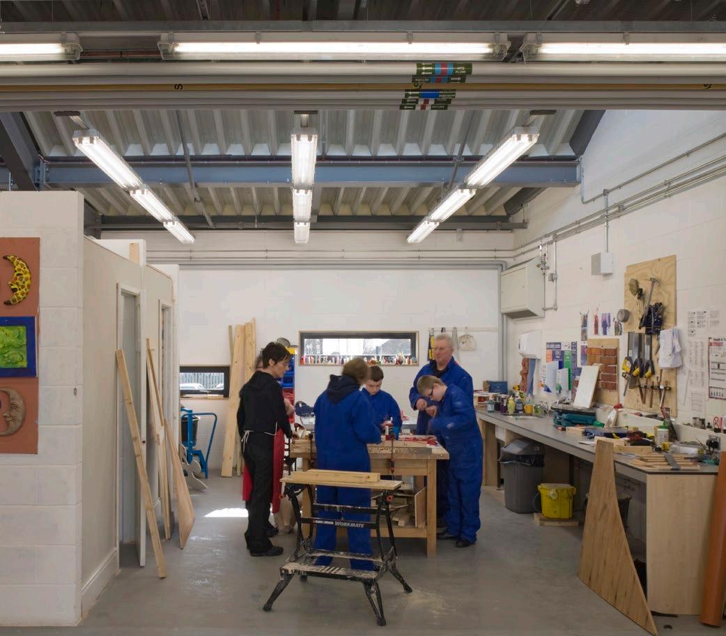 The wider landscape creates different areas for learning through landscape including sporting facilities, allotments, wood craft areas, mountain bike tracks, performance spaces together with a geodesic greenhouse. The Learning Centre also house a real life working wing with a café, shop, car mechanic workshop, construction training area, catering kitchen and manufacturing opportunities.