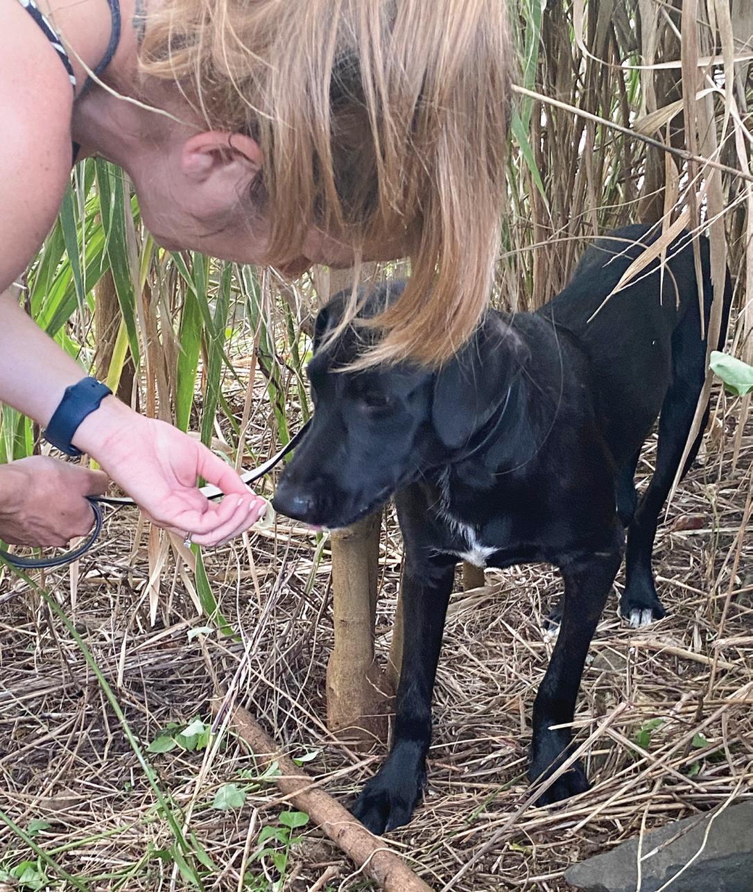 On the way to the windward side of O‘ahu with my family, we spotted a dog running along the side of the road. Seeing no human nearby, we pulled over and my daughter and I leapt out to try and secure the dog. The young, medium-sized dog was very scared, so my husband and son stayed in the car to minimize the number of people confronting the pretty, black hound mix. My daughter got to exercise her animal body language and handling skills, and stuck with me through the entire process.