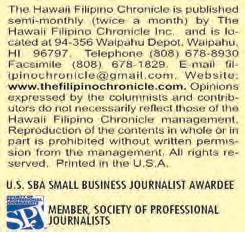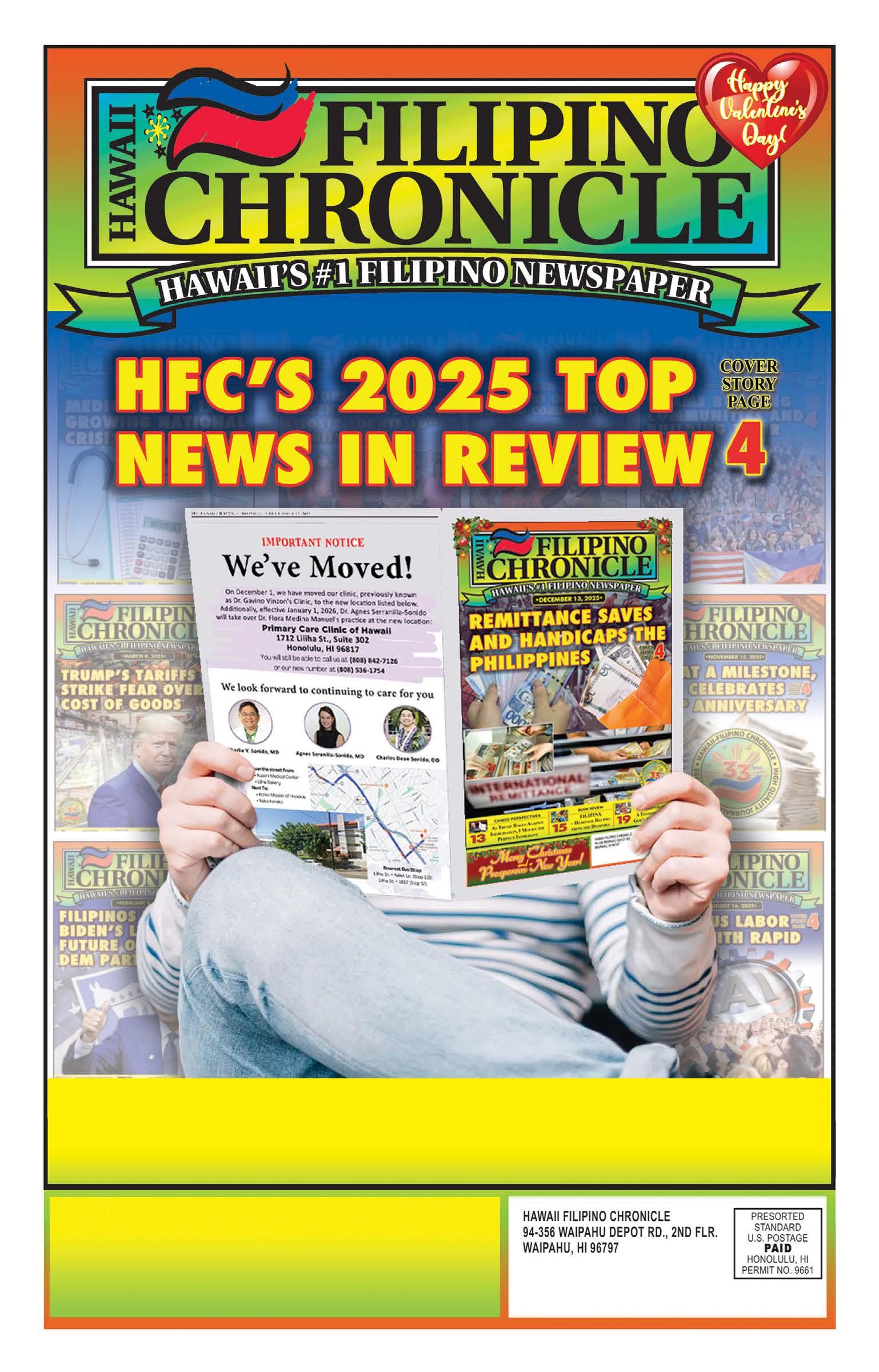 We hope you enjoy these stories and our other news and columns. Lastly, I’d like to wish our readers and supporters a very Happy Valentine’s Day. May it be filled with love and lasting memories. Thank you for supporting the HFC. Visit our website thefilipinochronicle.com to get your free e-copy of each issue. Until the next issue, Aloha and Mabuhay!