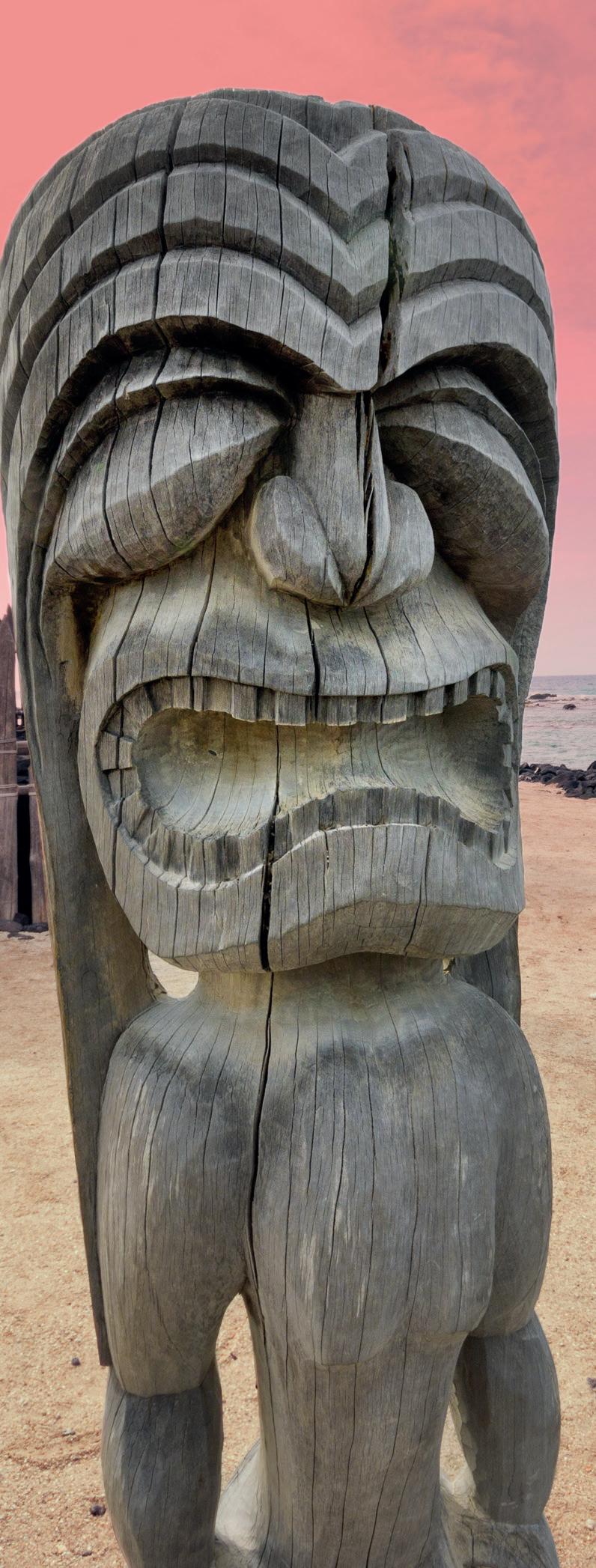 • At the tip of the point, encircled by imposing carved statues with fearsome expressions, ki'i, is the Hale o Keawe where the kahuna prayed and guarded the bones of 23 ali'i (Hawaiian Royalty).