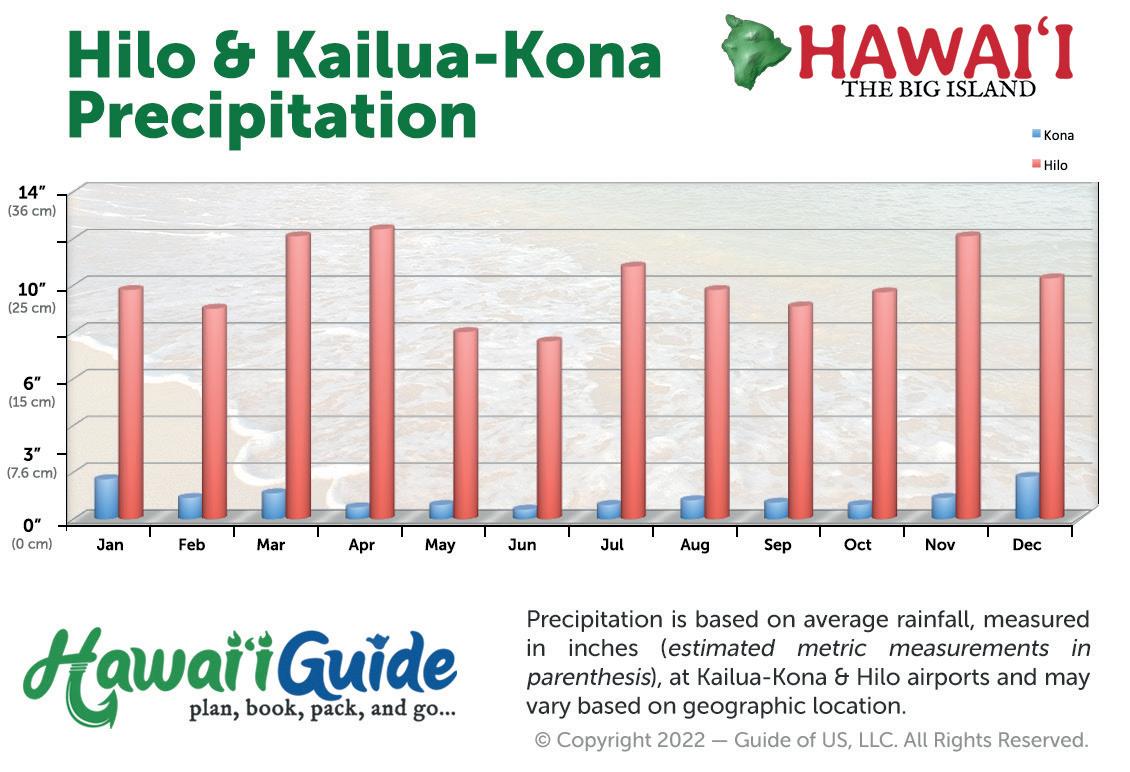 In some areas, rainfall can be absolutely zero; not a drop falls all year long and the terrain reflects this- it's dry and barren. In other areas, it can be rainy every day of the year (as in Hilo or Puna), creating a lush paradise for visitors who enjoy that type of environment.