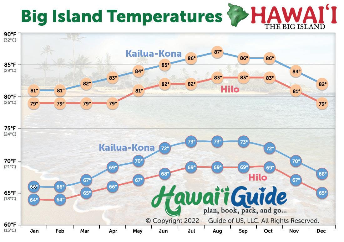For the most part, the Big Island is warm and tropical year-round. Average temperatures near the major resort areas (coastline) range from 75-85°F (23°C-29°C) in winter and summer, respectively. At the higher elevations like Volcano and Waimea, temperatures are often much cooler, especially during the night. Hilo can also have lower temperatures depending on how far mauka (inland) you travel. And, of course, the summit of Mauna Kea and flanks of Mauna Loa or Hualalai can be quite chilly, if not downright frigid.