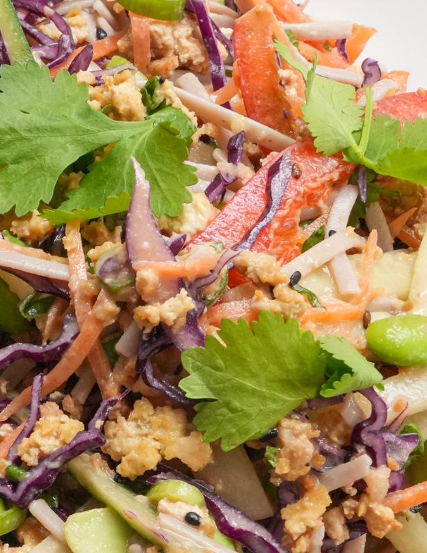 4. Assemble the salad. In a large bowl, combine the tofu, chilled soba noodles, edamame, red pepper, cabbage, carrot, cucumber, green onions, sesame seeds, and cilantro. Add the dressing, toss well to coat, and serve.