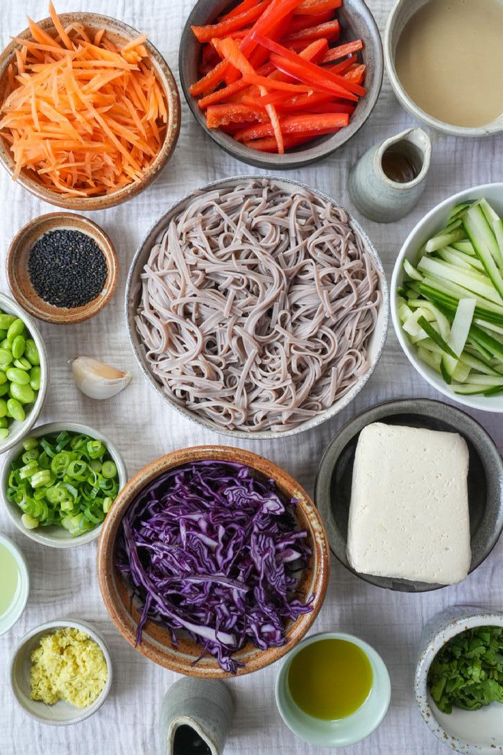 1. Cook the noodles. Bring a pot of water to the boil and cook the soba noodles according to package instructions (typically 4–5 minutes). Drain and rinse well under cold water to stop the cooking process and to prevent sticking. Chill.