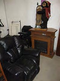 APPLIANCES & HOUSEHOLD FURNISHINGS: Amana upright deep freeze, like new; Older Hot Point refrigerator/freezer; (2) 110 window air conditioners; 3-pc. living room suite incl. 3-cushion sofa w/end recliners, loveseat & matching recliner chair; 3-pc. bedroom set incl. king-size bed, double dresser w/mirror & nightstand; Large oak desk w/overhead bookcase; Round oak table; (4) upholstered swivel roller chairs; Outdoor patio table w/stone top & (6) matching chairs; Pellet grill; Dyson upright vacuum; Canopy tent; Refrigerator dolly; Giodano Viagg 10 tandem bike for two, like new; Asst. of pots, pans, dishes & kitchen items.