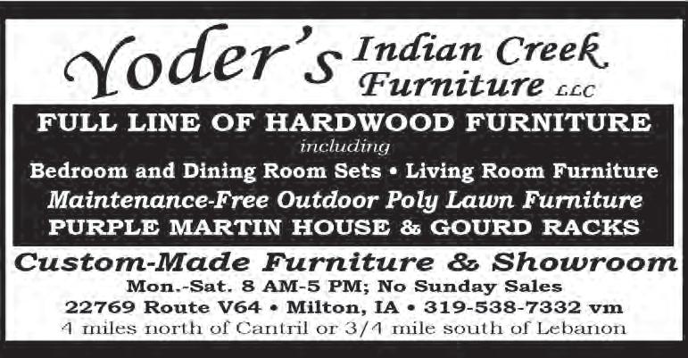 Hawkeye Trader, May 10, 2024 Page 16 www.hawkeyetrader.com 641-664-3990 www.awmetal.net Need Rebar? Wholesale info@harrisonfishery.com GINGERICH SAWMILL, INC. Buyers of standing timber. Walnut & soft Maple (our specialty), also other species. Bonded. WE PAY BEFORE CUTTING BLOOMFIELD, IA • 641-722-3002 30Years In Business G CUSTOM BUILT PAINTED & VINYL BUILDING & SHEDS Many Styles & Optional Features Available FREE DELIVERY WITHIN 30 MILES Hillview Mini Barns David W. Schrock VM: 641-664-2842 15383 180th St Drakesville, IA RENT TO OWN 16 YEARS EXPERIENCE FIVE STAR FEST GUN SHOW 2530 Hwy 22 • Riverside, IA Friday, May 17th • 1:00 - 8:00 PM Saturday, May 18th • 8:00 AM - 5:00 PM To Reserve Your Tables Call Delmar 319-430-2711 • Lonnie 319-461-0019 $5.00 Admission Fee Lunch on Grounds • Free Parking Auctioneers: Delmar Yoder 319-430-2711 Lonnie Miller 319-461-0019 5starauction.com C&C Cycle Chariton, IA • 888-475-2243 2018 Polaris Ranger XP 1000 4x4, New Tires, EPS, Clean Unit www.cc-cycle.com $12,995 NO DOC FEES! C&C Cycle Chariton, IA • 888-475-2243 2018 Kawasaki Vulcan S ABS, Corbin Seat, Bags, 5K Miles www.cc-cycle.com $5,395 NO DOC FEES! 2011 Bobcat T650 Tracks, Heat/AC, Door, 3600 Hrs LAMBIRTH’S TRUCKS 641-943-2551 $25,000 -- High quality farm with a CSR2 of 87 offered in two tracts --- Both tracts are located on a hard surfaced road --- Close to river markets and commodity processors -LAND AUCTION SIMULCAST LIVE AND ONLINE For more information on property details, please contact: Sean McDonald, AFM/Agent Phone: (319) 310-5405 SMcDonald@FarmersNational.com Dennis Rahe, Agent Phone: (319) 270-1010 DRahe@FarmersNational.com www.FNCRealEstate.com 191.06± Acres • Louisa County, Iowa Morning Sun Community Center | 106 N Main Street | Morning Sun, IA Wednesday, June 12, 2024 at 10:00 AM Bidding starts | Monday, June 10, 2024 at 8:00 AM Bidding closes | Wednesday, June 12, 2024 at close of live event To register and bid go to: WWW.FNCBID.COM A-21918 Mid-States Horse & TACK AUCTION Check Us Out & Like Us on Facebook @ Mid-States Livestock Sales to See Our Early Listings and Videos! For More Info: Josh Weaver 660-341-7964 • Jeb Weaver 660-341-1866 Kirksville Livestock Market Hwy 63 North • Kirksville, MO Saturday, May 25, 2024 Tack @ 10:00 AM - Horses @ 2:00 PM TEUBEL SALVAGE 19387 Ice Avenue Bloomfield, IA 52537 641-722-3844 • Cell: 641-799-8371 • AC D-15 SII, Wide Front End, Aftermarket 3 Pt, $2,800 • IH 966, Wide Front End, Fenders, 3 Pt or Fast Hitch, $6,700