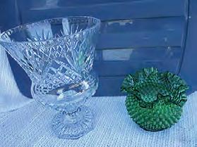 ANTIQUES & COLLECTIBLES: Glassware…Fenton, Art glass & more. Nice Waterbury 8-day mantel clock; Children’s prints; Christmas items; 10 Gal Pittsburgh Diamond crock; 6 Gal Plymouth Stoneware Fort Dodge crock; 4 Gal Red Wing churn; 2 Gal Western churn; 6 Gal Black crock; 4 Gal black crock; Green stoneware pitcher; 1 Gal salt glazed jug; 5 Star coffee crock jar (damaged); 9” Western bowl; 6” brown stoneware bowl; Brown stoneware cake mold; Unmarked butter crock; Sleepy Eye glass paperweight; Light blue large graniteware coffeepot; Nice wooden wagon (less tongue); Paper dolls; 2 Gal White Mountain ice cream freezer; Some stamps; Beer signs; Wooden bench; Child’s wooden stool; Some smalls; 22 Sterling rings, 6 Gold rings; Some costume rings & more.
