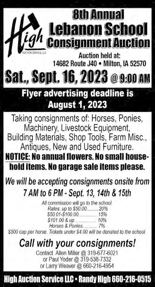 Hawkeye Trader, August 11, 2023 Page 2 www.hawkeyetrader.com DES MOINES DIESEL INC Servicing All Your Diesel Fuel Injection Needs Pumps, Nozzles & Turbos 1-800-475-6086 • 515-265-7318 3211 Delaware Ave Des Moines, IA 50313 1 Blk E. of the ADM Soybean Plant Ag & Truck Performance Parts 20’ & 40’ Storage Containers Starting at $1,895 For Sale or Rent ABC Portable Storage Delivery Available 563-299-2901 Dry & Mouse Proof Open Cell & Closed Cell Foam Call or Email Craig 641-328-4163 fivestarsprayfoam@gmail.com NEW CONSTRUCTION, REMODELS, POLE BARNS CRAWL SPACES, ATTICS & MORE Free Estimates • Fully Insured WWW.5STARSPRAYFOAM COM 5-STAR SPRAY FOAM INC. BROOKLYN MONTEZUMA W E N OW O FFER C ONCRETE R AISING & L EVELING 319.385.2000 | SteffesGroup.com Steffes Group, Inc., 2245 E Bluegrass Road, Mt. Pleasant, IA Upcoming Auctions View all upcoming auctions at SteffesGroup.com SlaytonPOLARIS 10456 State Route B, Downing, MO 63536 slaytonpolaris.com 2023 POLARIS RANGER 1000 660-328-6627 Call Dean or Tim to Order Your New Polaris Today! Shay Esbeck 660-605-0839 Barney Esbeck 660-605-0841 Justin Harlow 660-605-2346 WANTED BUYERS & SELLERS NEXT AUCTION SAT., AUGUST 26TH, 2023 CONSIGNMENT AUCTION join us on facebook! 2023 BandSequipmentsales.com BUY SELL TRADE EVERY DAY GALLATIN MISSOURI HAULING AVAILABLE • LIVE & ONLINE BIDDING • NATIONWIDE ADVERTISING • CONSIGN NOW! B&S EQUIPMENTAUCTION TOCALL DAY! C&C Cycle Chariton, IA • 888-475-2243 1978 Heritage Softail Mint Green & OBlack, Super Clean! Must See www.cc-cycle.com $8,995 NO DOC FEES! POST FRAME BUILDINGS • Best Quality • Great Prices • Great Service LANCASTER LUMBER, INC 800-424-5071 • LANCASTER, MO www.lancasterlumber.com AG RELATED FOR SALE: JD Walk Behind Self Propelled Mower, JS-63, 3 Speeds, Good Condition. 641-572-0061 8-11 FOR SALE: Brent 600 Killbros, 375 Heider 300 Wagons All Good Shape. 641-670-0626 8-11 FOR SALE: New Holland 782 Chopper, 824 Corn Head, In Excellent Condition, $3,500. 641-722-3967 8-25 FOR SALE: M-M Motor Parts G-1000 UP-G Parts Tractor 5 Star U Standard, Come Look Have More. 660-341-6318 ETFN FOR SALE: JD 145 48 Inch, 22 HP Riding Mower, 272 Hrs., $800 OBO; 12 Ft. Hydraulic Dump Trailer Made From Dump Truck, $800 OBO. 319-461-4027 8-11 FOR SALE: JD 55 Combine Excellent Original Condition. 641-751-8382 TFN FOR SALE: DUE TO HUSBANDS Recent Death Selling A 1947 2N Ford Tractor, Blade, Boom And Extra Tires And Rims. Asking $5,000 For All. 573-881-1129 8-25 FOR SALE: 6 Big Round Bales Of Straw, Twine Tied, $40 Bale; 3,000 BU Steel Bin, Torn Down, $1,000; 2014 Dodge, Standard Cab, 175k Miles, $18,000. 641-777-8420 8-11
