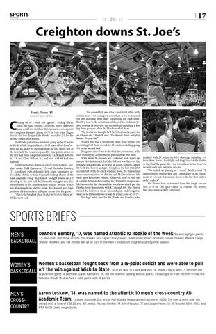 oming off of a solid win against a reeling Marist team, the Saint Joseph’s University men’s basketball team could not win their third game in a row against the Creighton Bluejays, losing 83-79 on Nov. 16 at Hagan Arena. The loss dropped the Hawks’ record to 2-1 for the second consecutive season. The Hawks got out to a fast start, going up by 12 points in the first half, largely due to a 6-13 team effort from behind the arc and 9-10 shooting from the free throw line in the first half. The team was paced by nine points apiece in the first half from Langston Galloway, ’14, Ronald Roberts Jr., ’14, and Chris Wilson, ’15, and took a 45-40 lead into halftime. Tough individual defensive efforts from Roberts, redshirt senior Halil Kanacevic, ’13, and DeAndre Bembry, ’17, combined with defensive help from teammates allowed the Hawks to hold Naismith College Player of the Year candidate Doug McDermott to eight points on 2-5 shooting in the first half. McDermott’s struggles may also be attributed to the rambunctious student section, which was deafening from start to finish. McDermott gave high praise to the atmosphere in Hagan Arena after the game. “This is the toughest place to play we’ve ever played at,” McDermott said.