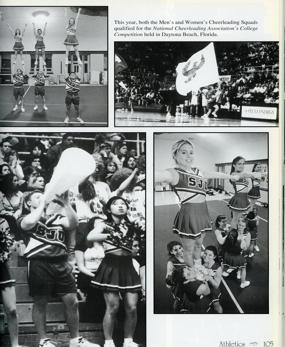 In a St. Joe’s yearbook from 1998 found in the St. Joe’s Archives Collection, a page dedicated to cheerleading features photos of these two historic teams, including action shots of team members practicing and cheering at basketball games. A roster also lists the two teams’ total 32 players, with 27 women and five men across the two teams.