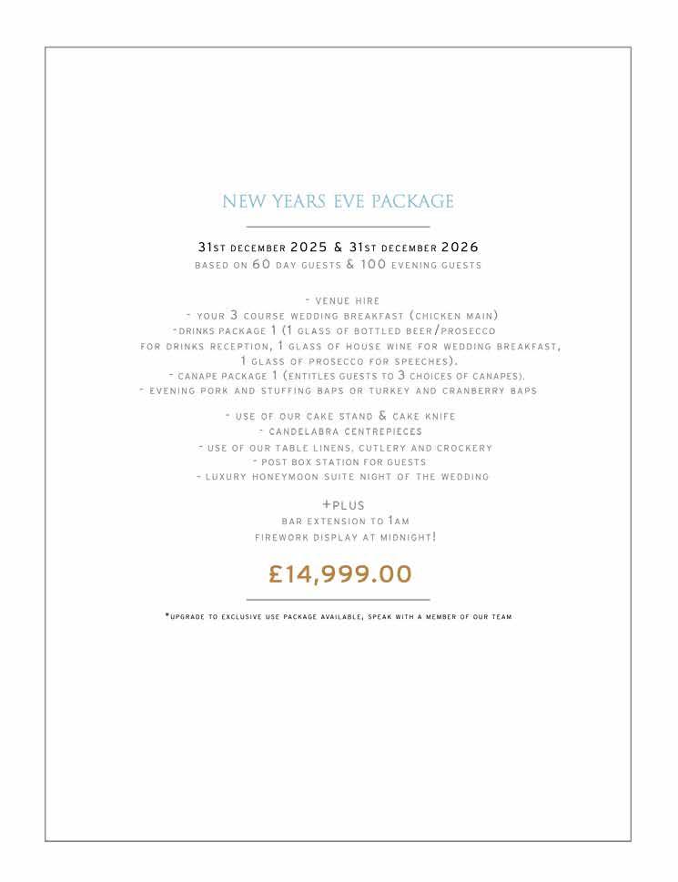 SHOULD YOU WISH TO HIRE WESTON HALL IN ITS' ENTIRETY, INCLUDING THE CELLAR FOR YOUR DRINKS RECEPTION AND EVENING RECEPTION USE, AN ADDITIONAL CHARGE OF £3,000 WILL BE ADDED TO YOUR INVOICE.