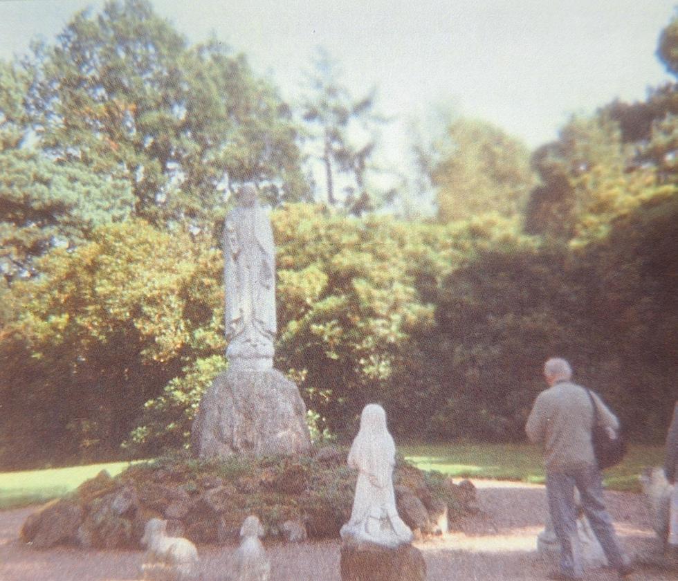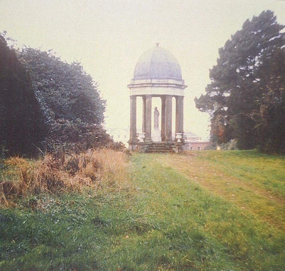 peered through dense rhododendrons and spotted groups of nuns walking towards the Rotunda—commonly referred to as the temple. Nearby stood the site of a second temple, long since fallen in a storm. Scattered around were religious stone statues and sheep figures resting at the base of the old structure. The nuns often gathered here for quiet prayer, surrounded by the serenity and beauty of the grounds. Although we knew Hawkstone Hall was private property, we always respected the religious occupants and the sacredness of the place.