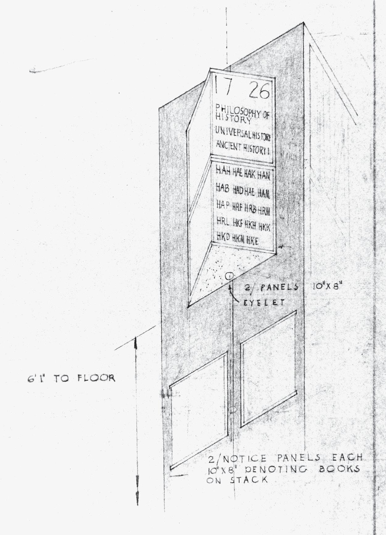 As first constructed, the stack rooms between the first and fourth floors of the Warburg Institute on Woburn Square had drop cords hanging from the smooth plaster ceiling, located precisely at the ends of each shelf stack such that the books in each bay of the collection could be illuminated by a line of strip lights placed exactly over the centre of the aisle between the shelves. To achieve this, the exact layout of the shelving units, a modular system in steel, had to be defined as part of the detailed design process for the concrete floor slabs that covered each storey, and of the electrical layout of the conduit that was cast into them. A detail from the working drawings for the project reveals the trouble taken to achieve this: the drawing is intended for electricians and those who laid out the shuttering for the structure of in-situ concrete planks that covered each floor and the terracotta coffers that spanned between them. Bibliographic organisation reached far into the material make-up the building.