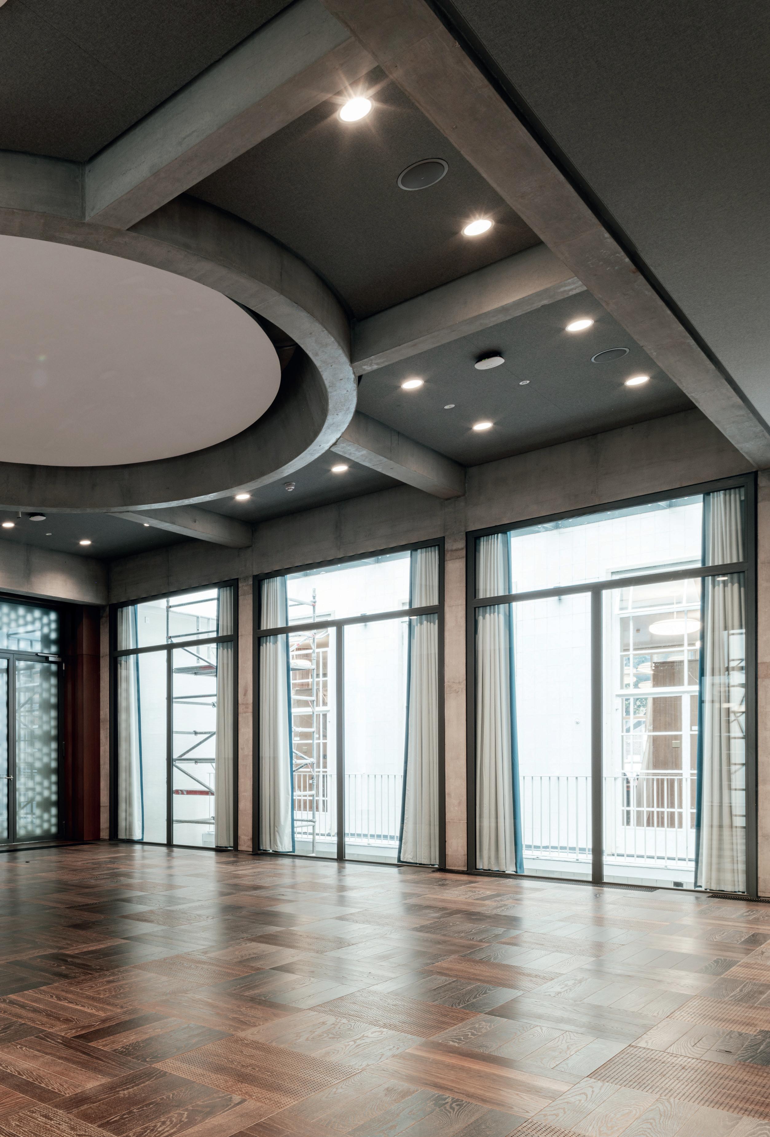 Ceilings were important in all the Warburg Institute buildings. In the original institute in Hamburg, the most important space in the project received its own special ceiling treatment: the reading/lecture hall, elliptical in form, was covered by an elaborate ceiling with mouldings running around a central, decorative oculus. The 1957 scheme developed in London was true to the mid-century modernism of its architect, Charles Holden, creating an undisturbed plaster ceiling plane throughout the building, interrupted only by carefully placed light fittings and, in the stack rooms, by drop-cords to control illumination in separate sections of the collection. The Warburg Renaissance project re-emphasises the significance of three rooms on its public-facing ground floor, and, as in Hamburg, these receive special treatment in their ceilings. The new exhibition space and the renovated reading room use a Ligno acoustic timber system, producing a subtly textured surface and a pleasing rhythm. The new Reemtsma Auditorium, constructed within the building’s courtyard, echoes Warburg’s original ellipse in Hamburg, but imprints this onto a coffered concrete structure. These are locations where contemporary craftsmanship has been crucial. The tolerances in the exhibition room ceiling slats are less than 1mm; the lecture room concrete slab and reflecting disc were both formed on site.