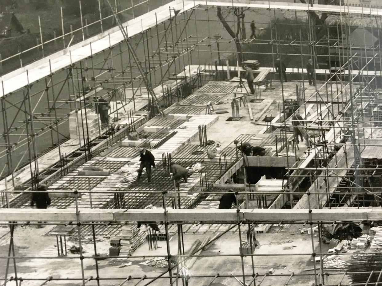 Construction photo, Warburg Institute, ca. 1955, showing build-up of floor slab structure accommodating heating pipes and radiant panels.