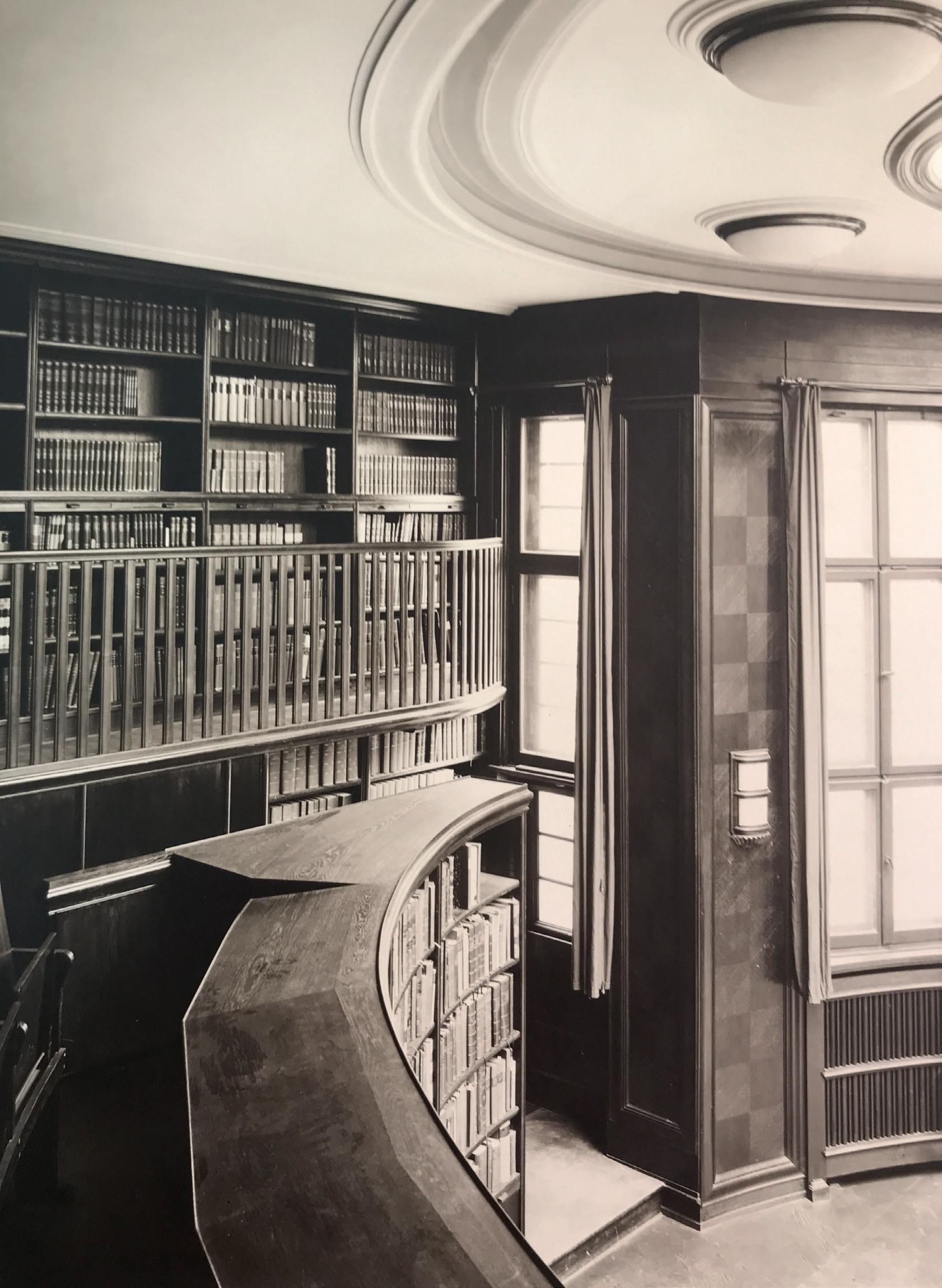 Ceiling and mezzanine to the Reading and Lecture Room, Kulturwissenschaftliche Bibliothek Warburg, Hamburg, ca. 1927.