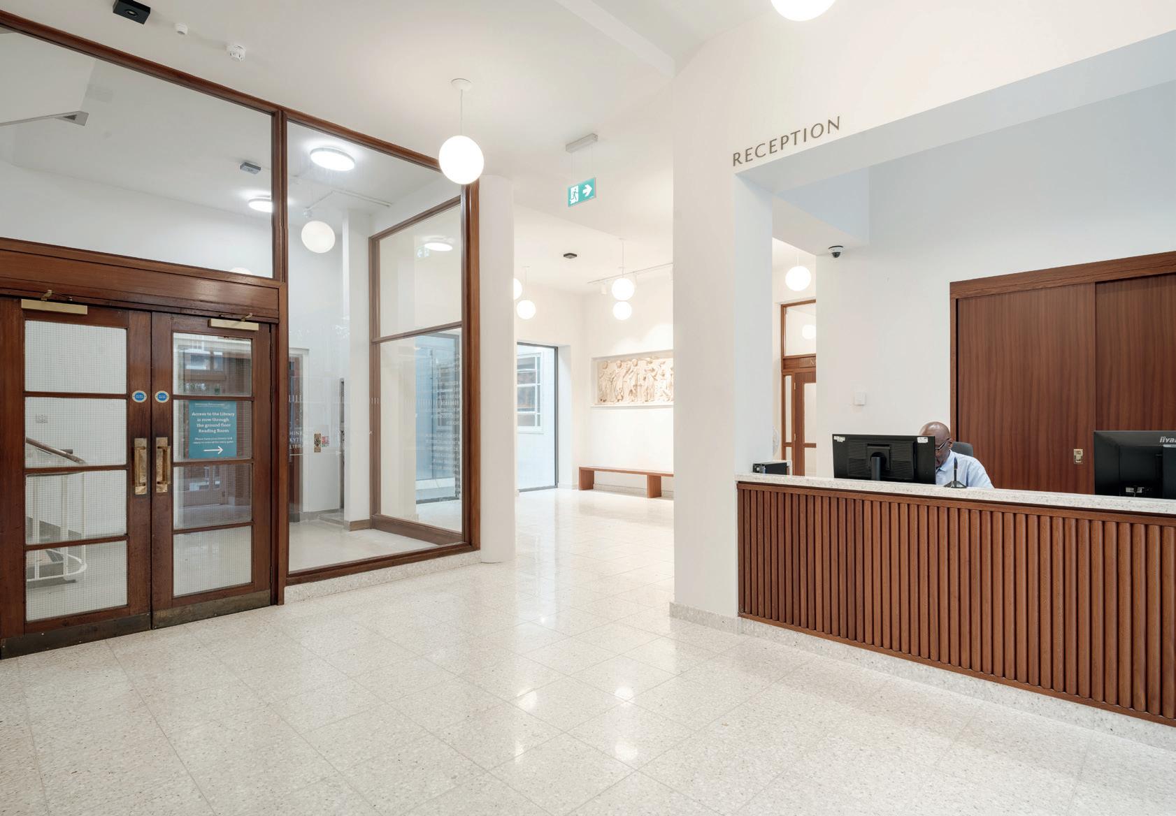 The entrance to the Warburg Institute sits slightly awkwardly at one end of the least-public façade of the building, placed on Woburn Square according to a plan for a much larger, and never-to-be built structure of which the 1958 project formed a fragment. The original entrance sequence was slightly forbidding. Blank double doors, their style reflecting Holden’s other buildings for the University of London, were surmounted by the Institute’s emblem set in stone. Entering the main interior crabwise, visitors navigated a glazed screen to approach the window of an enclosed reception kiosk, where readers’ cards were shown, or admission applied for. The Warburg Renaissance Project subtly amends this sequence, redisposing its elements and opening up the interior space, while leaving the external arrangement intact. A new reception desk, echoing that of the original Holden scheme, provides a welcoming and inspiring point of arrival; visitors standing at it can see clean across the building, into the central courtyard/ light well, through the new lecture room, on across the reading room and out onto Torrington Place.