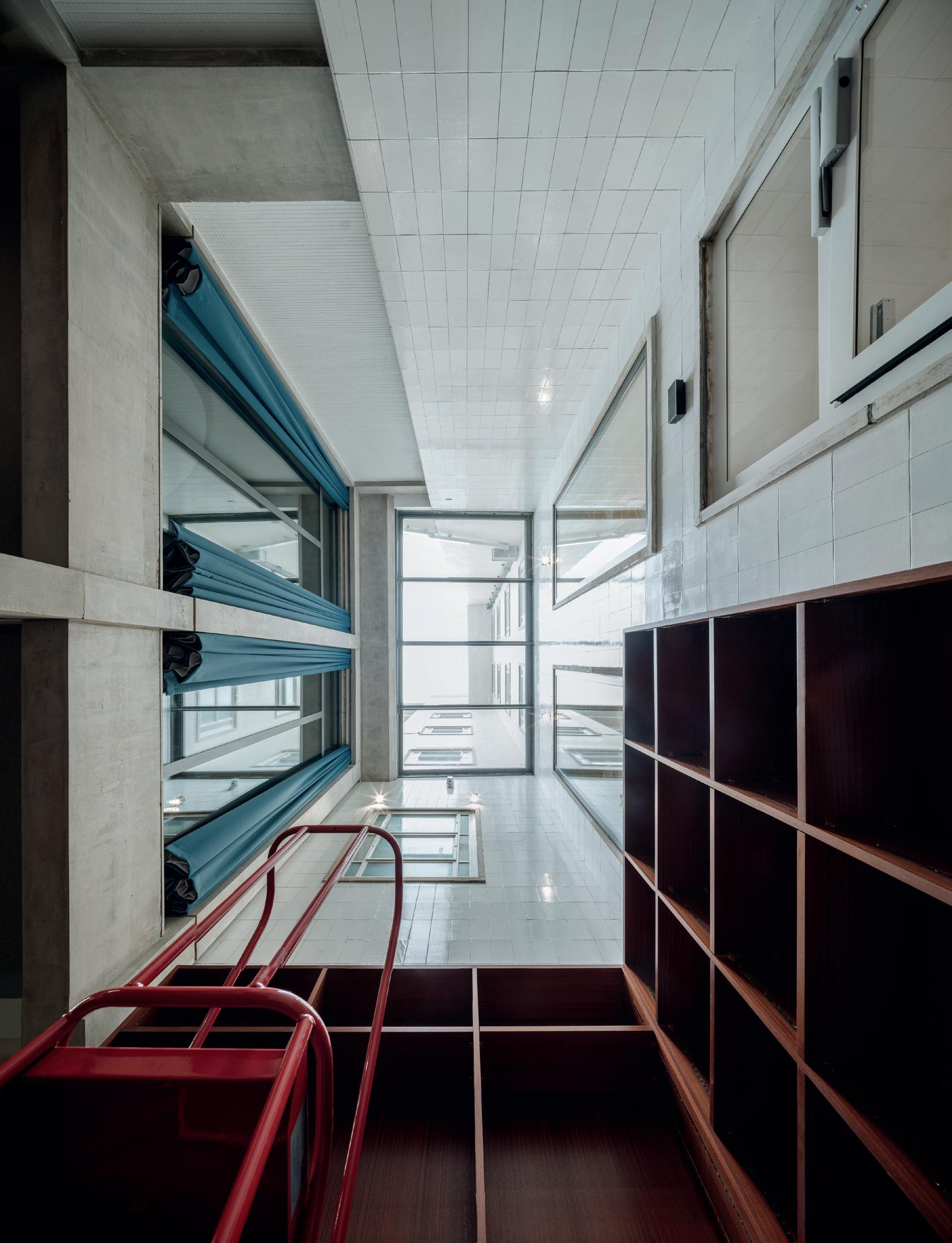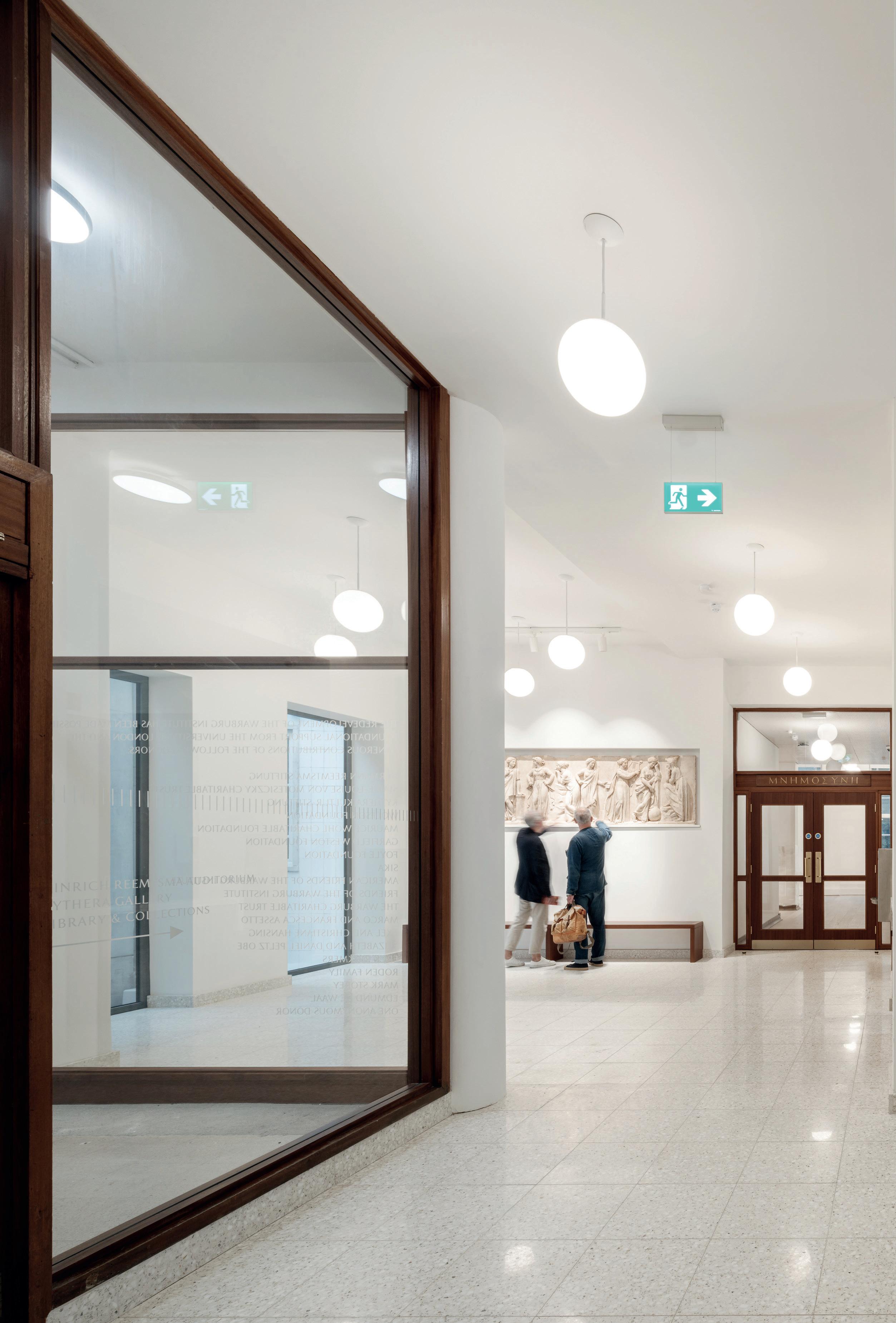 One of the most complex issues in architectural re-use is how to meet current requirements relating to climatic control and energy consumption in buildings developed before those requirements were in place. Often there is a minimum or a maximum strategy to be adopted: significant alteration in terms of mechanical systems, additional insulation or upgrades to elements such as windows, versus minimal alteration. The Warburg Renaissance project takes the minimal approach. The building remains naturally ventilated except in new-build areas and locations such as the exhibition area, where some mechanical back-up is essential to meet museum conservation requirements. Secondary glazing to the original single-glazed windows is added internally. One area that required careful thought was the heating strategy. The 1958 project was heated and cooled through water pipes cast into the underside of the floor slabs, producing radiant panels in the ceilings intended to control the temperature on the floors below them. In replacing this system (which no longer functioned) with more conventional radiator units beneath the windows, the team had to negotiate the fact that the windowsills across the various floors of the building change level. A small essay in component selection ensued, finding elements that fitted the varying heights, were aesthetically acceptable, and which provided sufficient power.