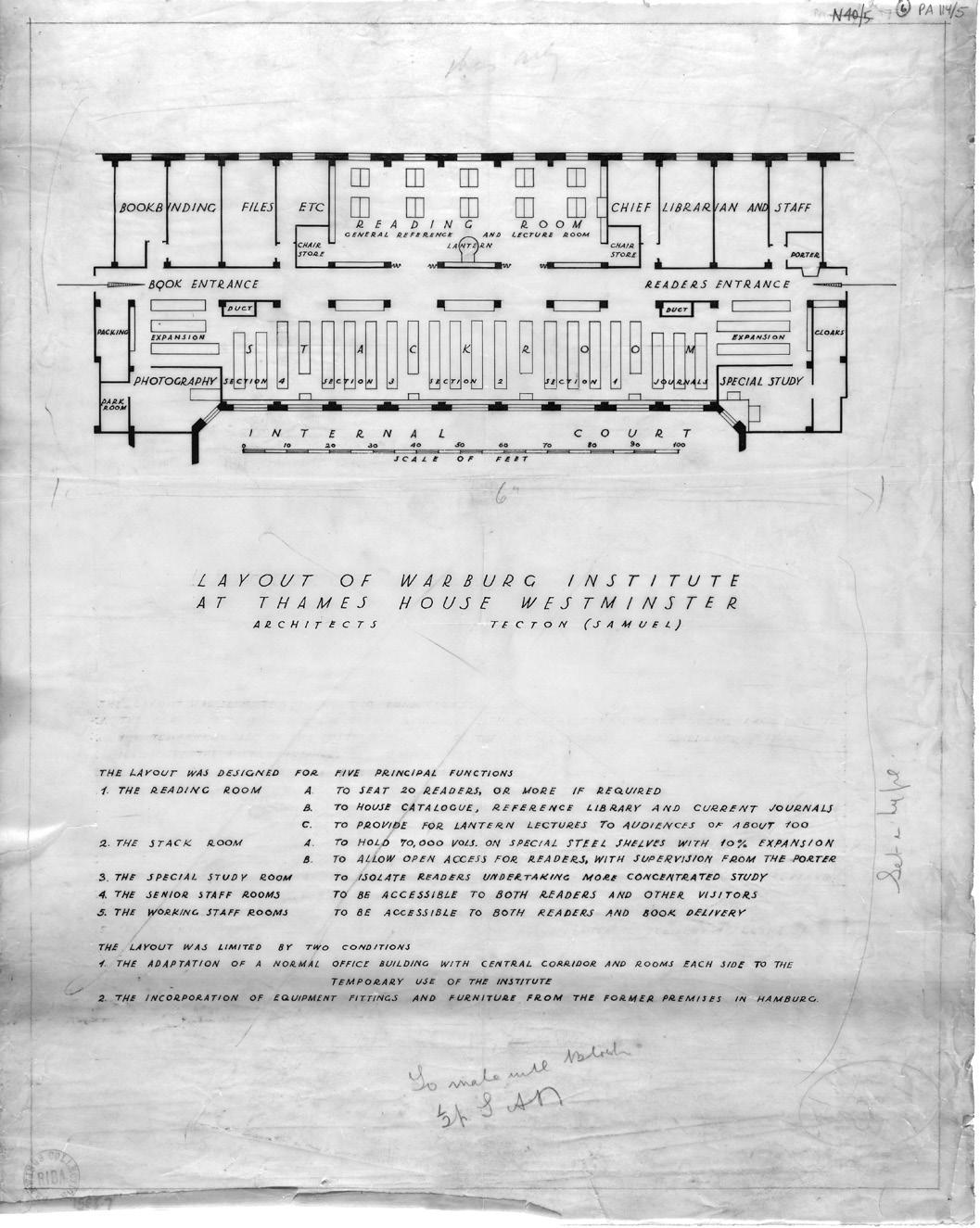 Tecton. Presentation plan, Warburg Institute, Thames House, 1934.