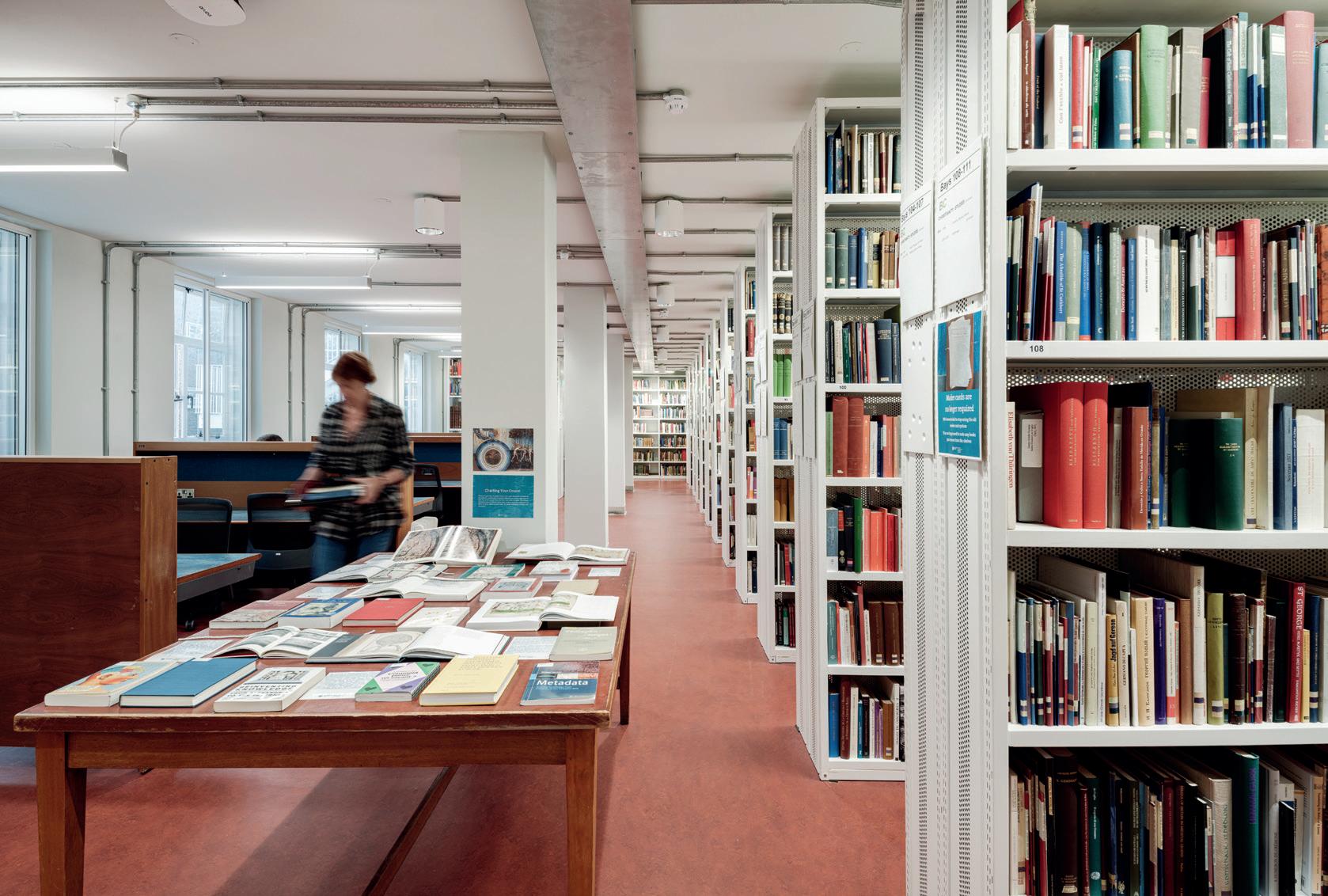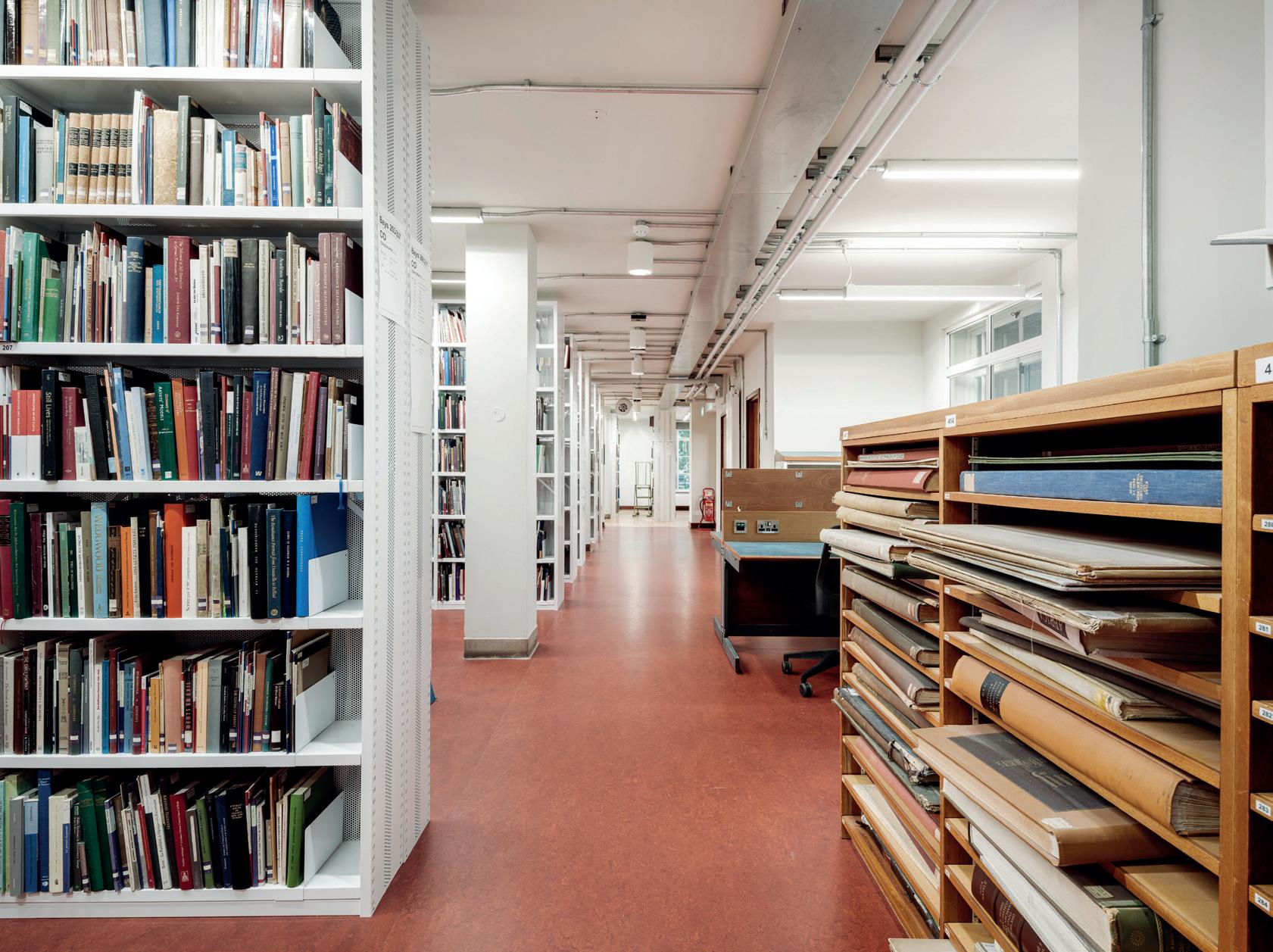 Libraries that collect physical books are an infinitely extending worm of shelving. A crucial dimension and limit is the total length that all those volumes require. The Warburg Institute, like any other library, was acutely aware of this never-ending problem, in which success in collecting always leads to problems in space. So aware, in fact, that when the institute moved to London in 1933, its director, Fritz Saxl, required English manufacturers to produce metal stack shelving in one-metre instead of 3-foot modules, so that the spatial expansion could be calculated exactly. Henri Frankfort, who succeeded Saxl, provided for the architects of the 1958 building a plan diagram that specified both the module and the density of the shelving, which in turn became a basic controlling factor in the scheme developed for Woburn Square. The Warburg Renaissance Project expands the original shelving meterage by 40%, re-establishing the layout of the stacks that characterised the 1958 building, although increasing its density slightly (the aisles between the stacks are 850mm rather than 1050mm wide). Rollerracking was also introduced for the new Archive and Special Collections store. At a time when many libraries are reducing space for physical collections, the Warburg Renaissance project creates room for several decades of future growth.
