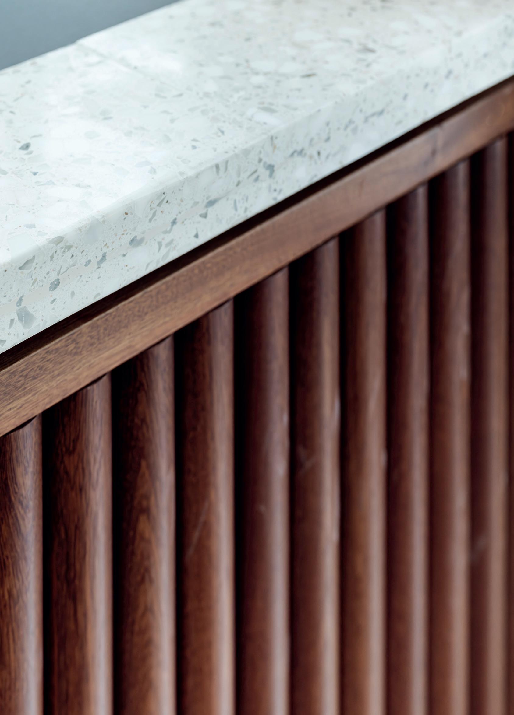 Material selection for the 1958 and 2024 schemes for the Warburg Institute involved very different processes. Britain during the 1950s was affected by supply issues and economic austerity beginning in the years after World War II. Timber was still a product of Empire; the main joinery elements in the 1958 building are mahogany or sapele, sourced from somewhere among the British Protectorates. Almost all component manufacture was national; there was a limit on what could be obtained and the original building projects some sense of this sparseness. In 2024, materials can come from anywhere: the acoustic timber ceiling system on the ground floor is German, the coloured cork panels used for the floor in the Wohl Reading Room are Italian and the grey bricks lining the courtyard structure are Danish. As well as budget, limits on material choice must now be introduced by an awareness of the embodied energy costs associated with transport and production, an ethical response that Haworth Tomkins has been instrumental in developing across the building industry. In some cases, materials that were available in the 1950s are still logical and ethical to use: the Warburg Renaissance project uses linoleum for the stackroom floors as did the 1958 building. In other cases more care is needed. The choice of terrazzo for the reception desk was only made after a careful assessment of its CO2 footprint.