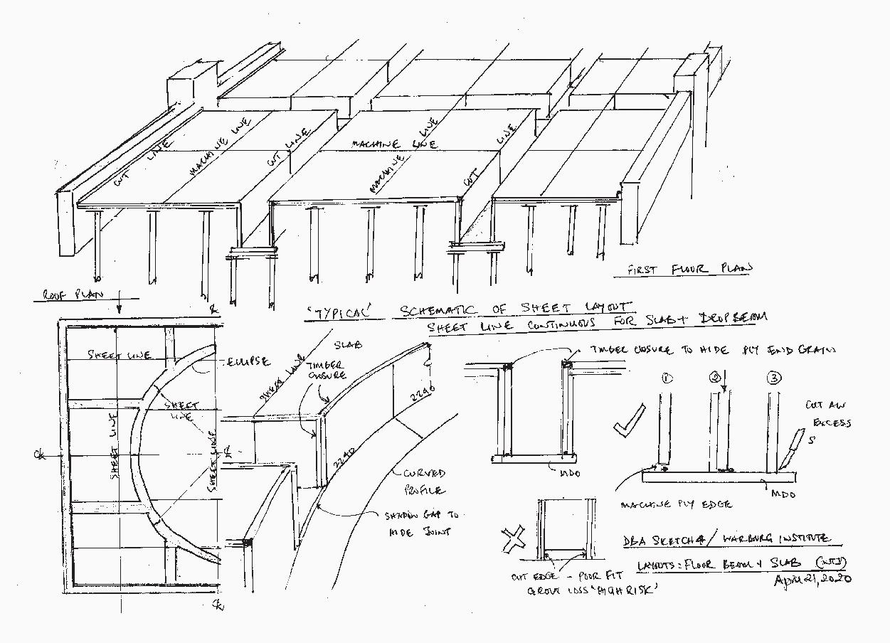 David Bennett formwork sketch for downstand beams and ellipse, Warburg Lecture Theatre, 2020.