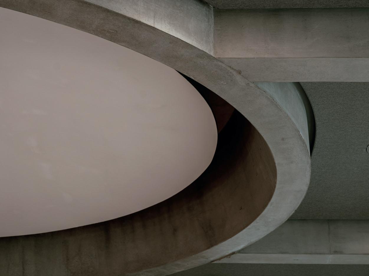 Warburg’s institute in Hamburg used an ellipse as the basis for the plan of its reading and lecture room. The geometry had a significance that was both intellectual and personal. Warburg’s view of the world was bipolar: life’s trajectory was a path governed by the simultaneous effect of dark and light foci; the rational and the irrational; superstition and raciocination; discipline and errantry. In his studies of the history of astrology and astronomy, the ellipse brooded as the figure that would finally account for the vagaries of the apparent motion of the planets across the sky, substituting scientific visions of the universe for equally powerful religious or mythological ones. In the Warburg Renaissance project the ellipse is reimprinted into the geometry of the new lecture room, articulated in the ceiling structure in an echo of the reading and lecture room in Hamburg. Here the figure is rendered in polished concrete around a central false oculus.