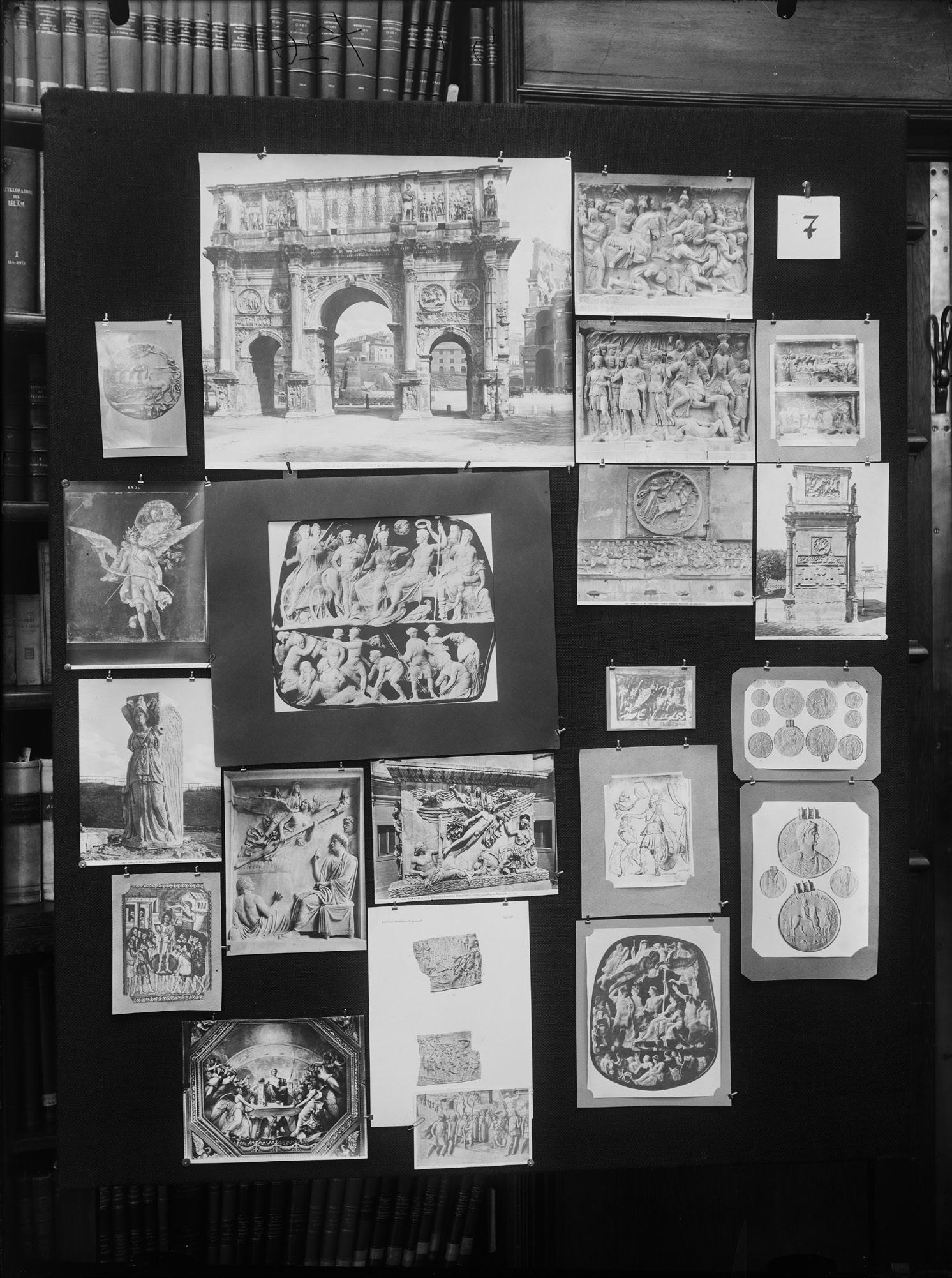 Aby Warburg, “Bilderatlas Mnemosyne,” panel 7 displayed in the reading/lecture room at the Kulturwissenschaftliche Bibliothek Warburg, Hamburg, ca. 1929.