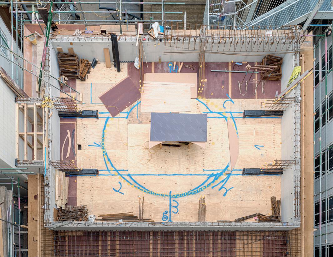 Reemtsma Auditorium, Aerial view of the elliptical concrete beam setting-out, Warburg Renaissance Project, 2024.