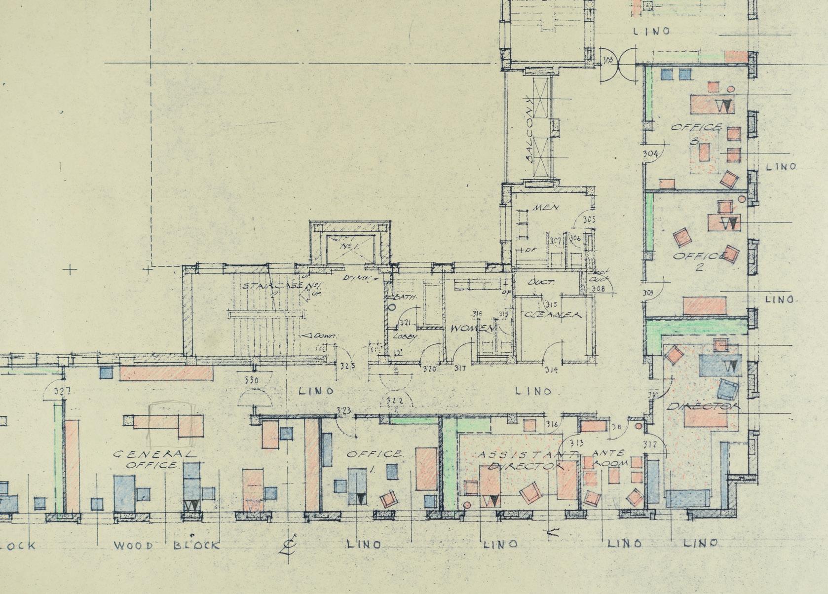 Adams Holden & Pearson Architects/Gertrud Bing. Marked up plan showing furniture location, room names and the “knuckle”, third floor, Warburg Institute, Woburn Square, ca. 1957.
