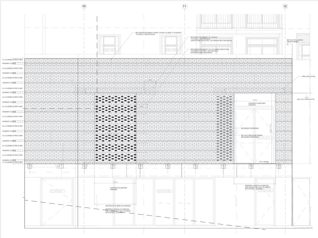 Haworth Tompkins, Working drawing setting out the brick coursing to the new courtyard façade, Warburg Renaissance Project. The main “English Garden Wall Bond” is animated with areas of “hit and miss” brickwork and recessed perpends.
