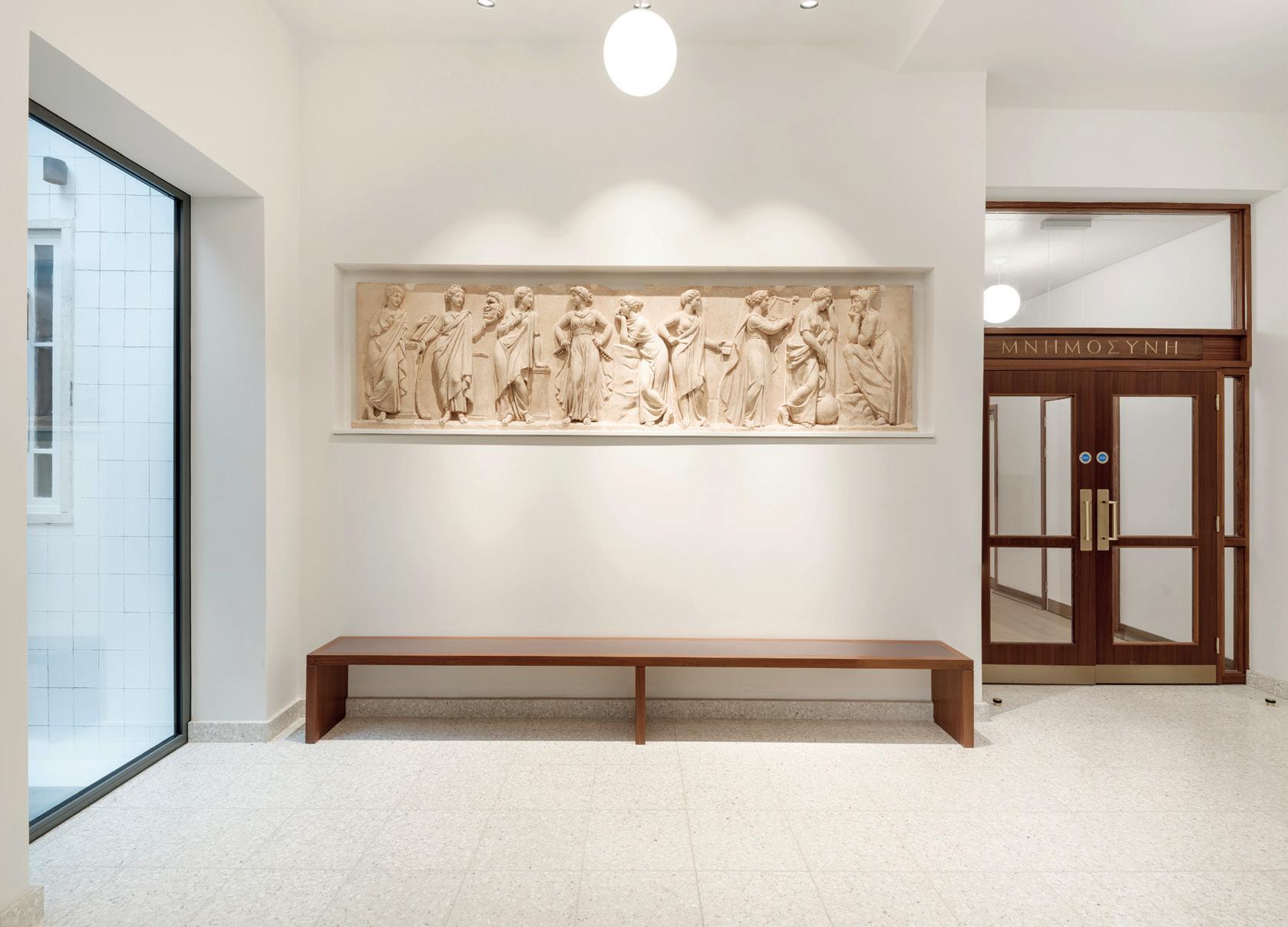 Mnemosyne. Memory. Past in present. The research themes of the Warburg Institute and the institute’s continuing involvement with architectural commissioning have always been intimately linked. In the original institute building in Hamburg, “Mnemosyne” was inscribed over the entrance door in a script designed by the city architect of Hamburg, Fritz Schumacher. As the 1958 project for the institute’s London home neared completion, the director, Gertrud Bing, insisted that the name of that presiding deity (Mnemosyne was the goddess of remembrance in ancient Greece) be reinscribed on the screen that separated entrance vestibule from main reception area. Visitors entered one building about memory via the memory of another. In the Warburg Renaissance project, Mnemosyne moves further into the plan of the Warburg Institute. The inscription is now placed immediately next to the frieze of the Nine Muses, over the doorway that takes visitors from the lobby into the exhibition space. This placement creates a kind of family reunion: Mnemosyne was the mother (with Zeus) of the classical muses of all arts and sciences.