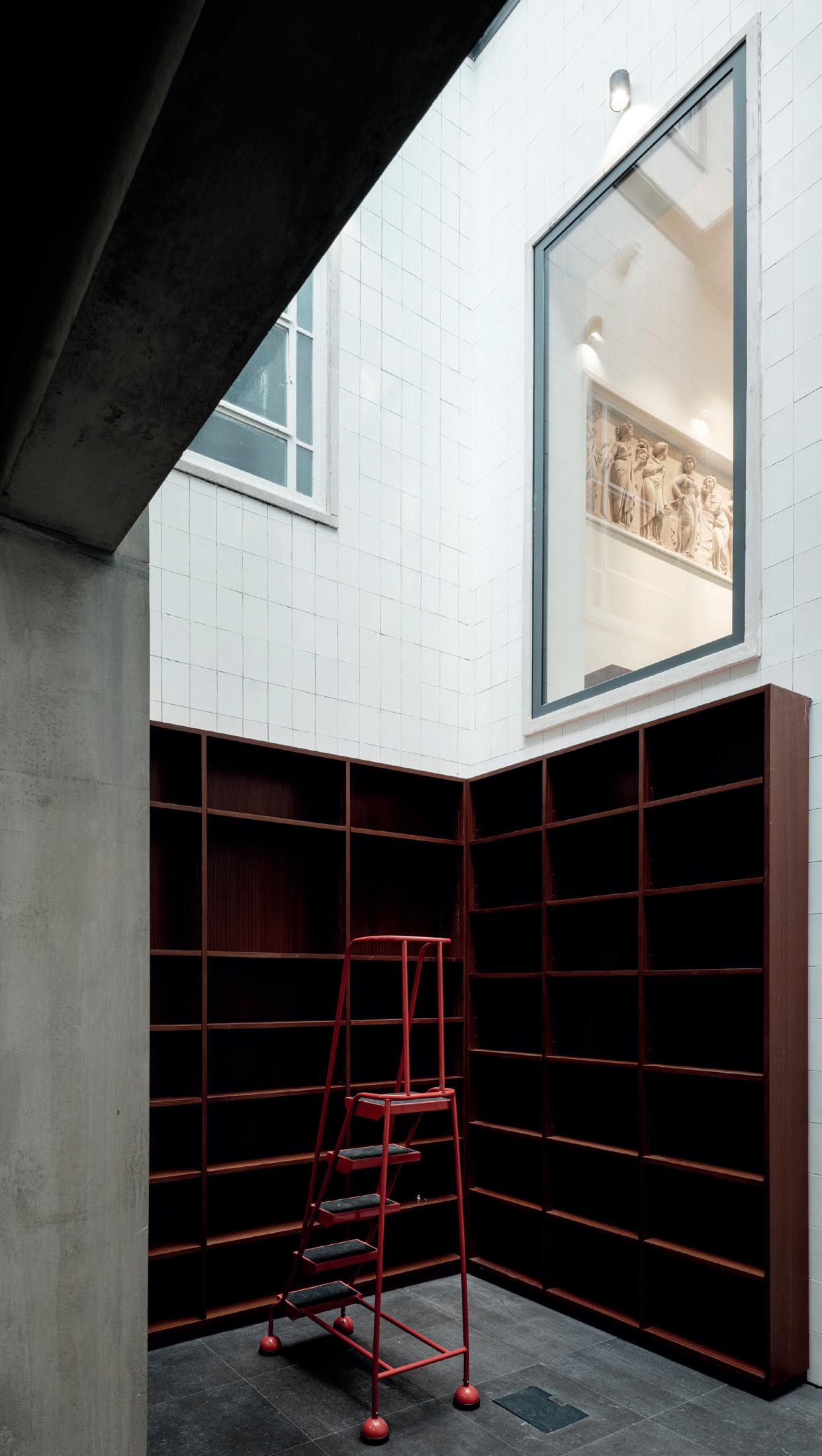 A major intervention in the Warburg Renaissance project involves the construction of the new Reemtsma Auditorium (above) and Wohl Reading Room (below) in the courtyard of the 1958 building. The courtyard has a curious history. Its white tiles reveal the ghost of the unbuilt project of which the Warburg Institute forms a part—the courtyard was to have been entirely internal; the white tiles were to reflect light. But they also echo a detail in the institute’s first London home, the ground floor of the monumental Thames House building on the Millbank embankment. There, as at Woburn Square, readers using the stackrooms gazed out into a white tiled light well. In the 1958 building, the glazed tiles of the courtyard, thick pieces of ceramic 6×9×1", reveal the care and craftsmanship that characterise the original design. They coordinate exactly with the window openings, whose surrounds meet the grout lines between in the tiles in a perfect match. The structure of the Reemtsma Auditorium, placed carefully within this space, is surrounded by minimal glazed roof strips, allowing light to travel down to the Wohl Reading Room at the base. The internal windows of the lecture room allow clear views across the building. The white reflective tiles now fulfil their intended function.