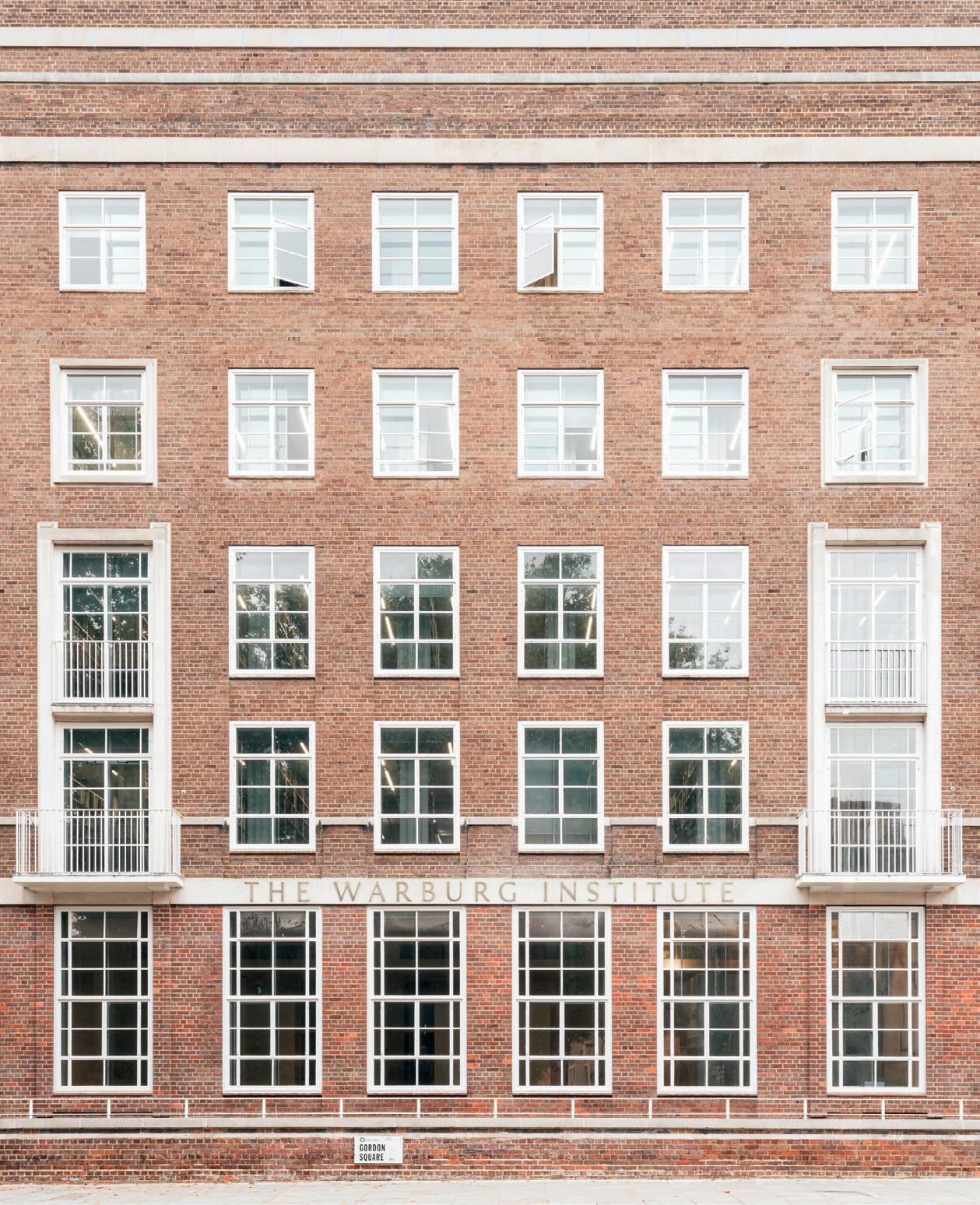 At its completion in 1958, the Warburg Institute project received indifferent reviews from the architectural critics of the time. Writing in the Manchester Guardian , Nicholas Pevsner compared the building to a telephone exchange. These reservations reflect the low-key, aesthetically conservative and apparently standardised quality of its three free façades. There is something of the Giles Gilbert-Scott telephone box about the building’s window proportions; repetition dominates the façades, while a pared-down classical scheme of brickwork relief and white concrete string-course banding reduces its effect.