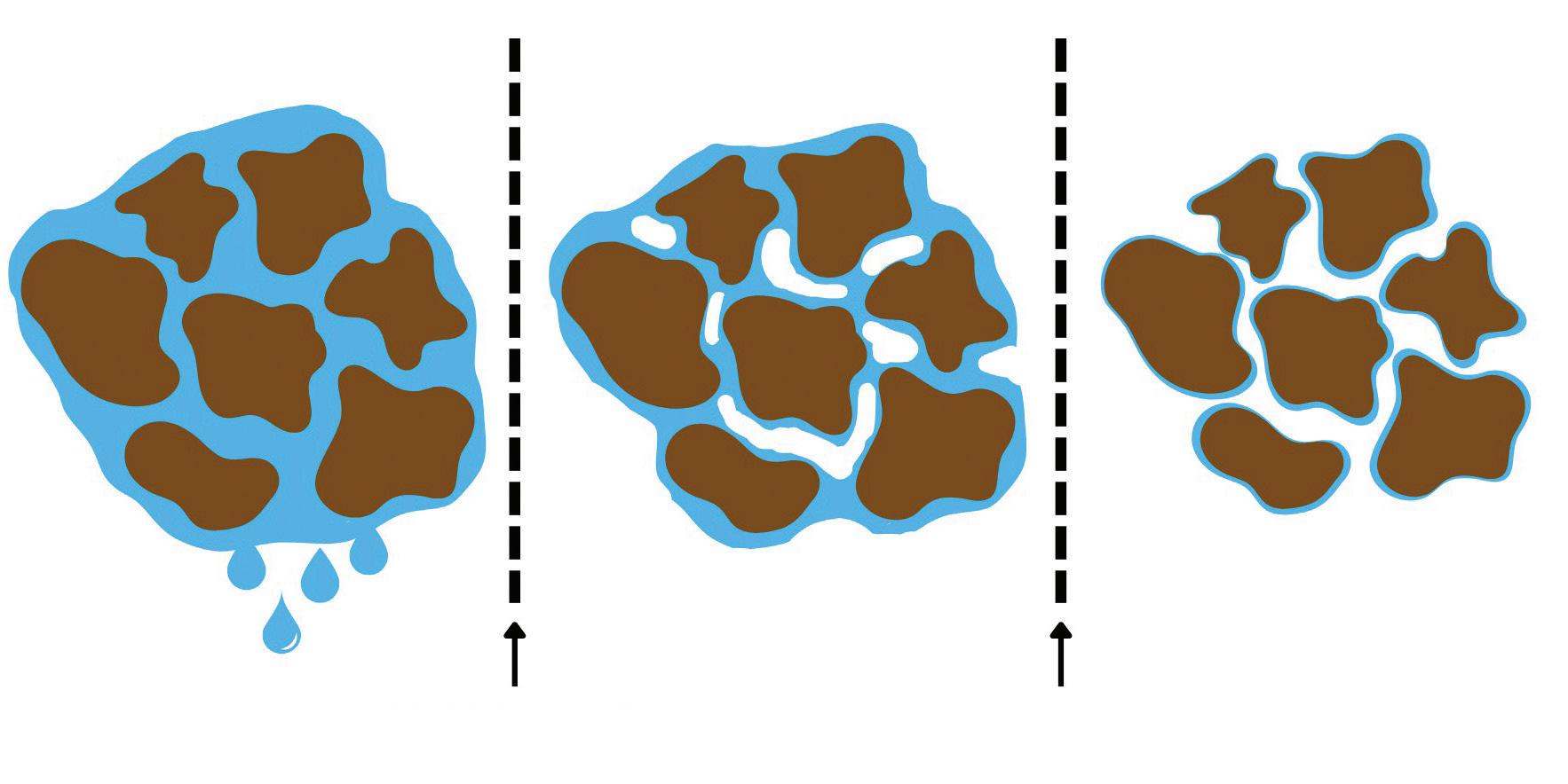 After a big rainfall, when you hear soil squelching under your boot, and it is difficult to walk or drive a tractor through, the soil is at saturation. This means all the air pores in the soil are filled with water (Figure 1, left). Water that drains quickly from macropores (larger pores) after saturation is called gravitational water. The force of gravity is stronger than the bonds between soil particles and water molecules (adhesive bonds) and the bonds between water molecules (cohesive bonds), so the water drains. This can take anywhere from a few hours to days, depending on the soil properties.