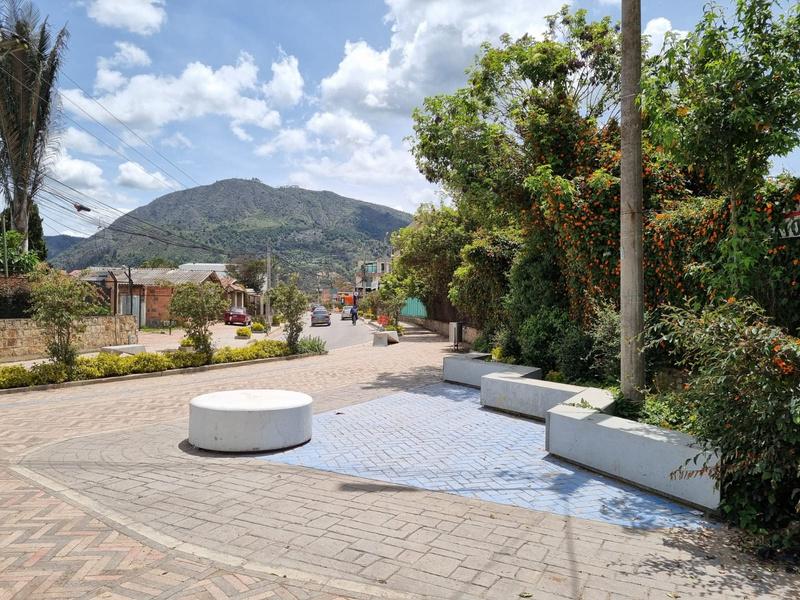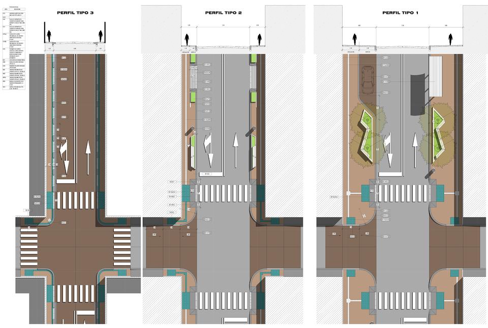 La adaptación de los nuevos andenes a distintos perfiles viales a causa de condiciones urbanas y suburbanas en tramo menor a 2 kms, establece una serie de momentos únicos que animan la circulación a lo largo del corredor Los pisos presentan un patrón de adoquines de distintos tonos, evocando los paisajes agrícolas de Cota. El mobiliario urbano complementa la idea central, con bancas que dan borde al ámbito peatonal y generan permanencias para el disfrute del espacio público