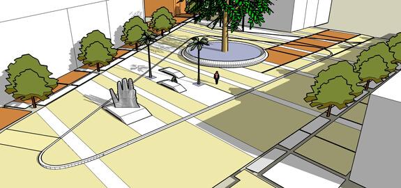 Para mejorar las condiciones de espacio público, se amplía la superficie de la Plaza El Canoero y los andenes del sector, motivando las permanencias. También se establece una cicloruta que conecta la plaza con otros puntos importantes de la ciudad, y sumado a un paisajismo con especies nativas, se diseñan patrones de pisos y mobiliario que evocan el paisaje cultural portolopense