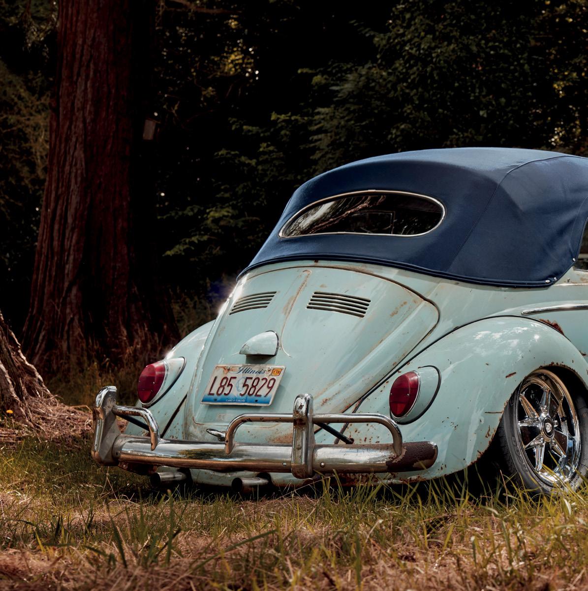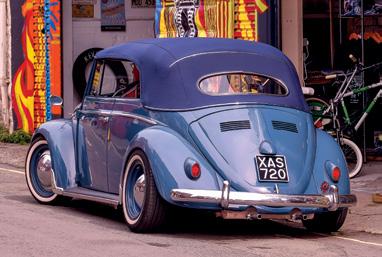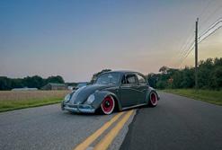 filthy but saveable seats, and a badly seized hood frame with nothing but a vague memory of anything more weather proof. The bonnet, decklid and doors were there, likewise the original 1200cc stale air motor, stock transmission, speedo, and crucially the glass, which again is a Cabrio-specific pain if missing, and one which isn’t equal for all Cabs either, as later models have different glass, frames, doors and so forth. With the structure back as nature intended and the repairs blended to the surviving paint in house, it was time to sort the stance out. Eva Resto supplied an 8” narrowed beam, a pair of their 2” kicked and adjustable spring plates, garnished with some dropped spindles and Eva rear shocks (“None